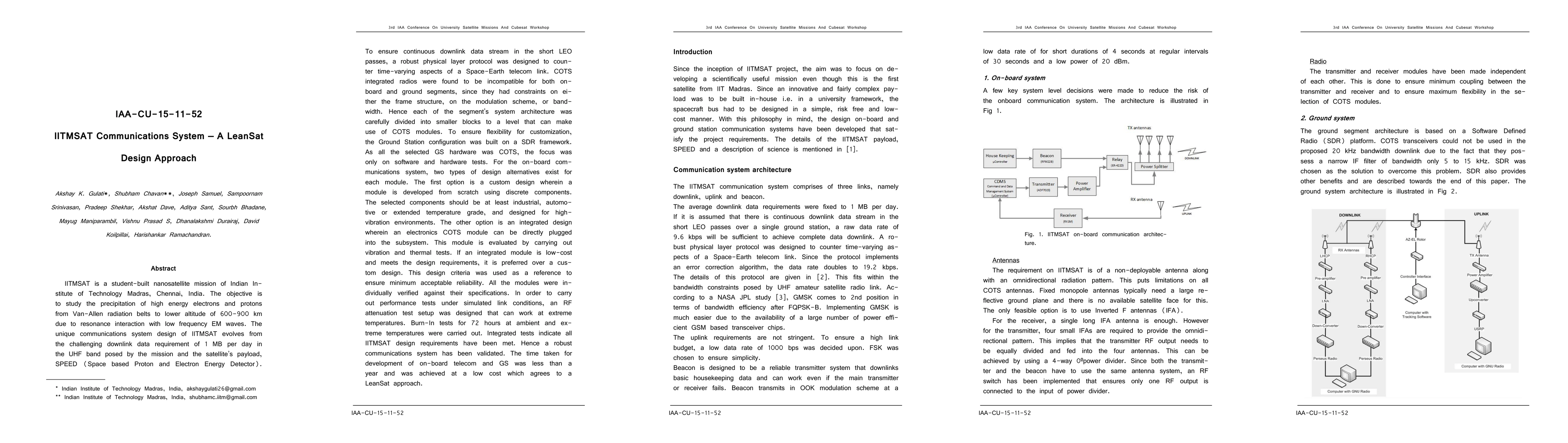 IITMSAT is a student-built nano satellite mission of Indian Institute of Technology Madras, Chennai, India. The objective is to study the precipitation of high energy electrons and protons from Van-Allen radiation belts to lower altitude of 600-900 km due to resonance interaction with low frequency EM waves. The unique communications system design of IITMSAT evolves from the challenging downlink data requirement of 1 MB per day in the UHF band posed by the mission and the satellite's payload, SPEED (Space based Proton and Electron Energy Detector). To ensure continuous downlink data stream in the short Low earth Orbit passes, a robust physical layer protocol was designed to counter time-varying aspects of a Space-Earth telecom link. For the on-board communications system, two types of design alternatives exist for each module. The first option is a custom design wherein a module is developed from scratch using discrete components.The other option is an integrated design wherein an electronics COTS module can be directly plugged into the subsystem. This module is evaluated by carrying out vibration and thermal tests. If an integrated module is low-cost and meets the design requirements, it is preferred over a custom design. In order to carry out performance tests under simulated link conditions, an RF attenuation test setup was designed that can work at extreme temperatures. Burn-In tests for 72 hours at ambient and extreme temperatures were carried out. Integrated tests indicate all IITMSAT design requirements have been met. Hence a robust communications system has been validated. The time taken for development of on-board telecom and GS was less than a year and was achieved at a low cost which agrees to a LeanSat approach.