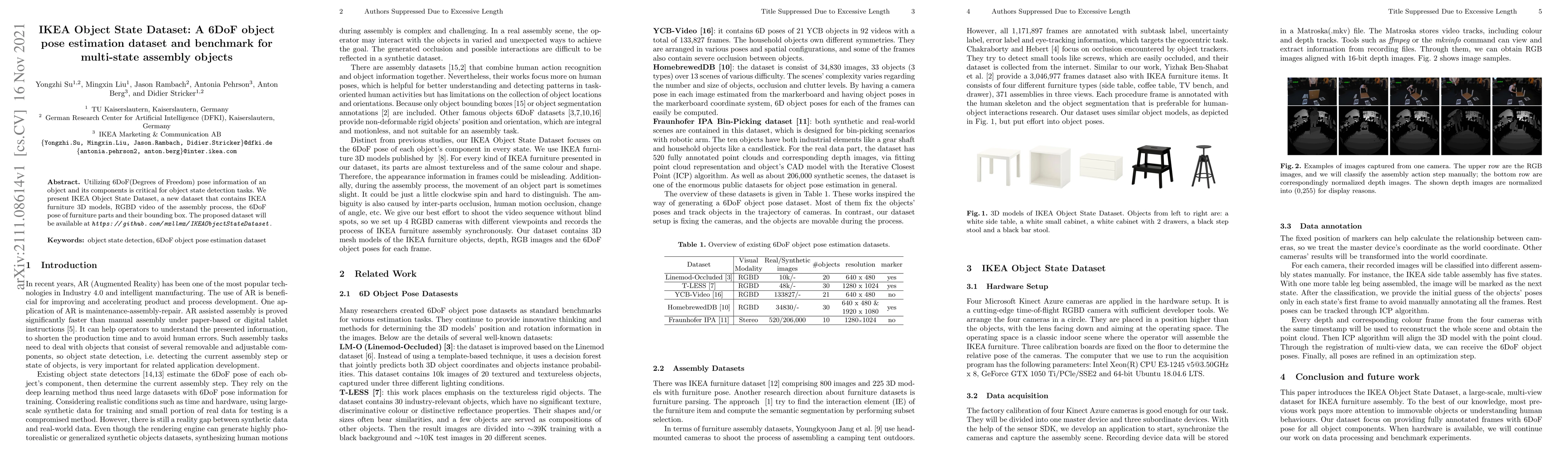 Summary: The IKEA Object State Dataset provides 6DoF pose information and RGBD videos for IKEA furniture assembly, facilitating object state detection research. The dataset is available for public use to benchmark multi-state assembly object pose estimation.