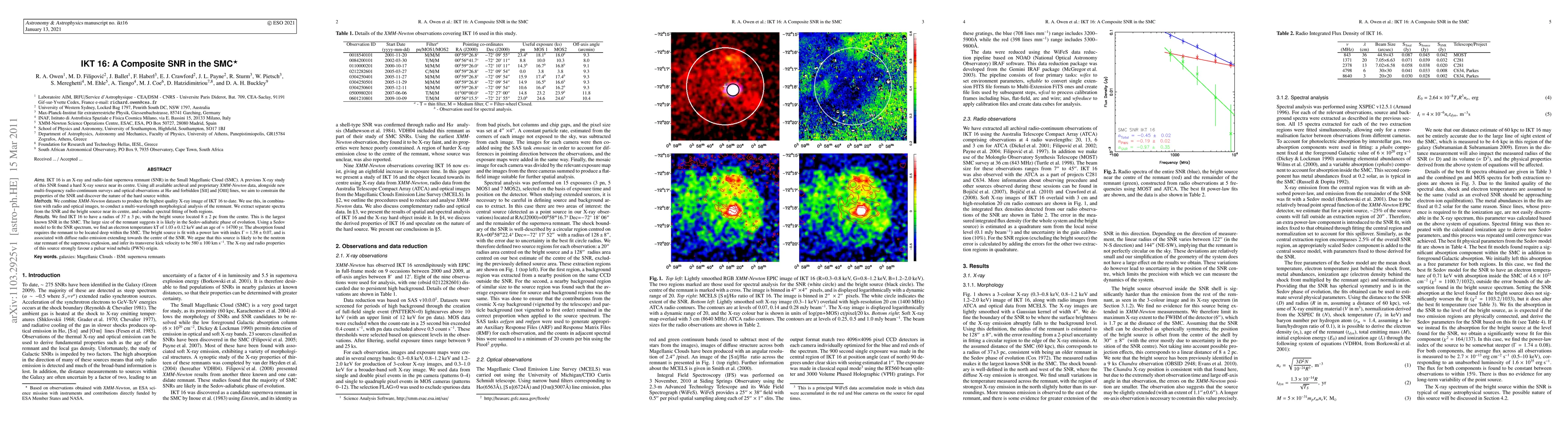 Aims: IKT 16 is an X-ray and radio-faint supernova remnant (SNR) in the Small Magellanic Cloud (SMC). A previous X-ray study of this SNR found a hard X-ray source near its centre. Using all available archival and proprietary XMM-Newton data, alongside new multi-frequency radio-continuum surveys and optical observations at H-alpha and forbidden [SII] and [OIII] lines, we aim to constrain the properties of the SNR and discover the nature of the hard source within. Methods: We combine XMM-Newton datasets to produce the highest quality X-ray image of IKT 16 to date. We use this, in combination with radio and optical images, to conduct a multi-wavelength morphological analysis of the remnant. We extract separate spectra from the SNR and the bright source near its centre, and conduct spectral fitting of both regions. Results: We find IKT 16 to have a radius of 37+-3 pc, with the bright source located 8+-2 pc from the centre. This is the largest known SNR in the SMC. The large size of the remnant suggests it is likely in the Sedov-adiabatic phase of evolution. Using a Sedov model to fit the SNR spectrum, we find an electron temperature kT of 1.03+-0.12 keV and an age of 14700 yr. The absorption found requires the remnant to be located deep within the SMC. The bright source is fit with a power law with index 1.58+-0.07, and is associated with diffuse radio emission extending towards the centre of the SNR. We argue that this source is likely to be the neutron star remnant of the supernova explosion, and infer its transverse kick velocity to be 580+-100 km/s. The X-ray and radio properties of this source strongly favour a pulsar wind nebula (PWN) origin.