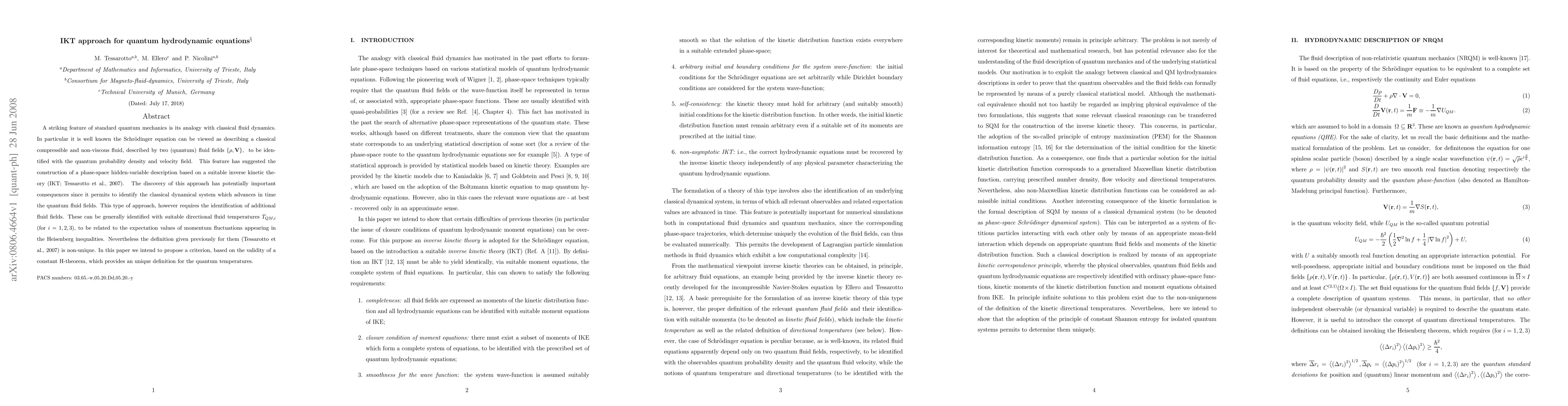 A striking feature of standard quantum mechanics is its analogy with classical fluid dynamics. In particular it is well known the Schr\"{o}dinger equation can be viewed as describing a classical compressible and non-viscous fluid, described by two (quantum) fluid fields ${\rho ,% \mathbf{V}} $, to be identified with the quantum probability density and velocity field. This feature has suggested the construction of a phase-space hidden-variable description based on a suitable inverse kinetic theory (IKT; Tessarotto et al., 2007). The discovery of this approach has potentially important consequences since it permits to identify the classical dynamical system which advances in time the quantum fluid fields. This type of approach, however requires the identification of additional fluid fields. These can be generally identified with suitable directional fluid temperatures $T_{QM,i}$ (for $i=1,2,3$), to be related to the expectation values of momentum fluctuations appearing in the Heisenberg inequalities. Nevertheless the definition given previously for them (Tessarotto et al., 2007) is non-unique. In this paper we intend to propose a criterion, based on the validity of a constant H-theorem, which provides an unique definition for the quantum temperatures.