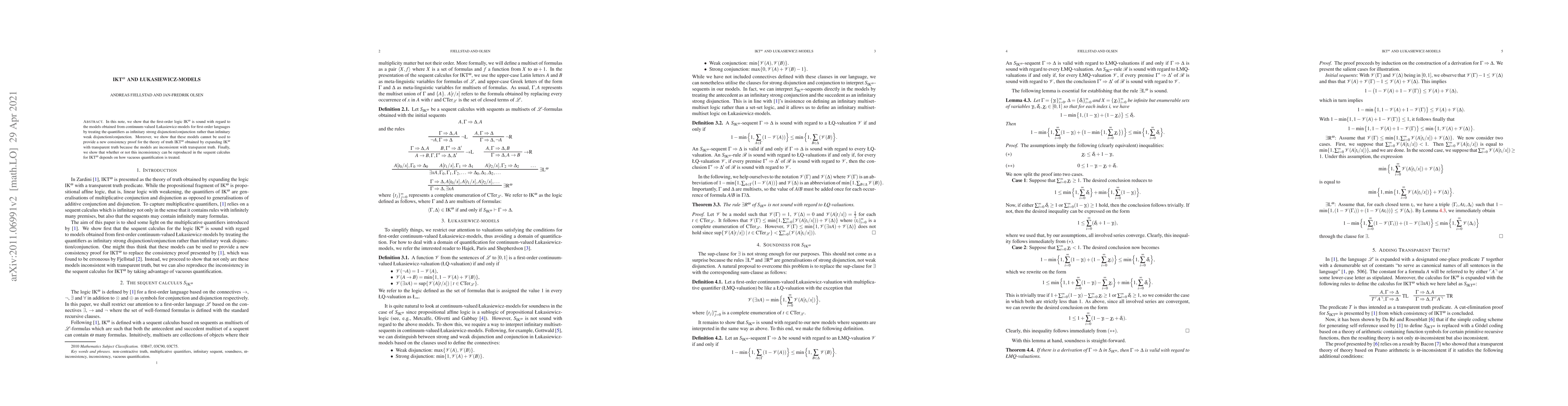 In this note, we show that the first-order logic IK$^\omega$ is sound with regard to the models obtained from continuum-valued \L{}ukasiewicz-models for first-order languages by treating the quantifiers as infinitary strong disjunction/conjunction rather than infinitary weak disjunction/conjunction. Moreover, we show that these models cannot be used to provide a new consistency proof for the theory of truth IKT$^\omega$ obtained by expanding IK$^\omega$ with transparent truth because the models are inconsistent with transparent truth. Finally, we show that whether or not this inconsistency can be reproduced in the sequent calculus for IKT$^\omega$ depends on how vacuous quantification is treated.