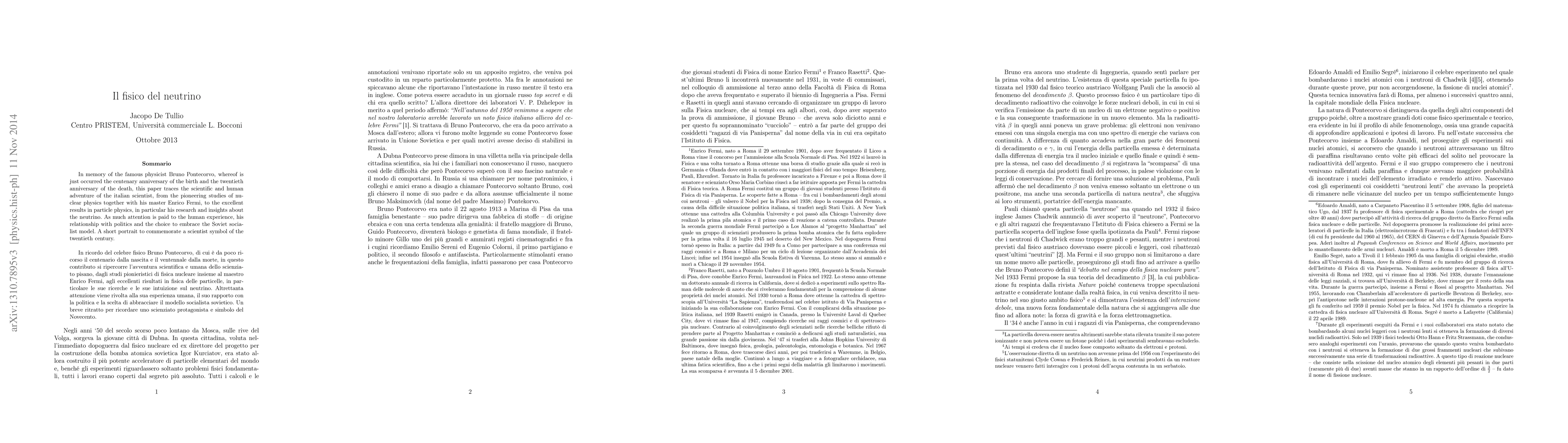 This paper honors Bruno Pontecorvo's life and work, tracing his contributions to nuclear physics and particle physics research on neutrinos. It also explores his personal journey, including his relationship with politics and the Soviet socialist model.