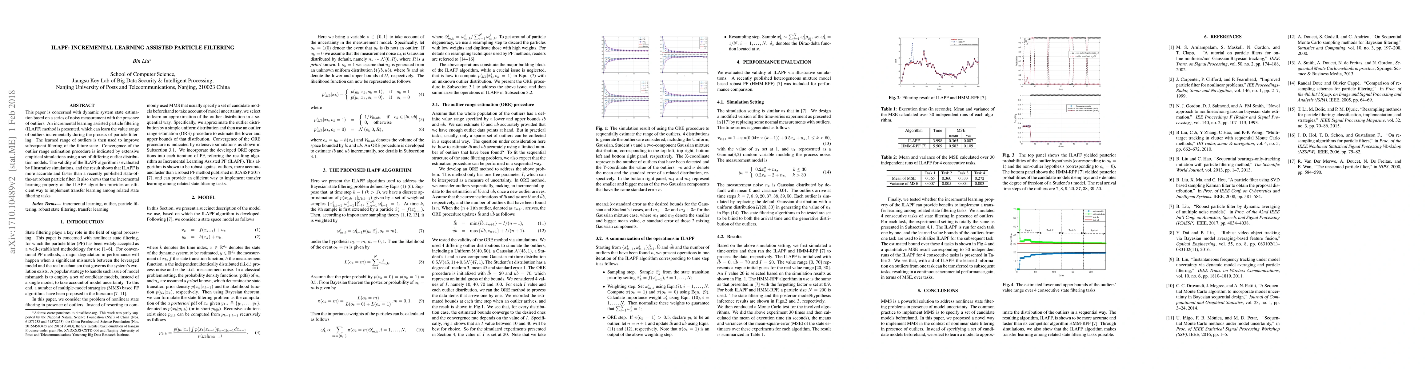 The paper proposes an incremental learning assisted particle filtering (ILAPF) method for dynamic system state estimation with noisy measurements and outliers. The ILAPF algorithm incrementally learns the range of outliers, improving future filtering accuracy and efficiency, and demonstrating superior performance compared to a state-of-the-art robust particle filter.