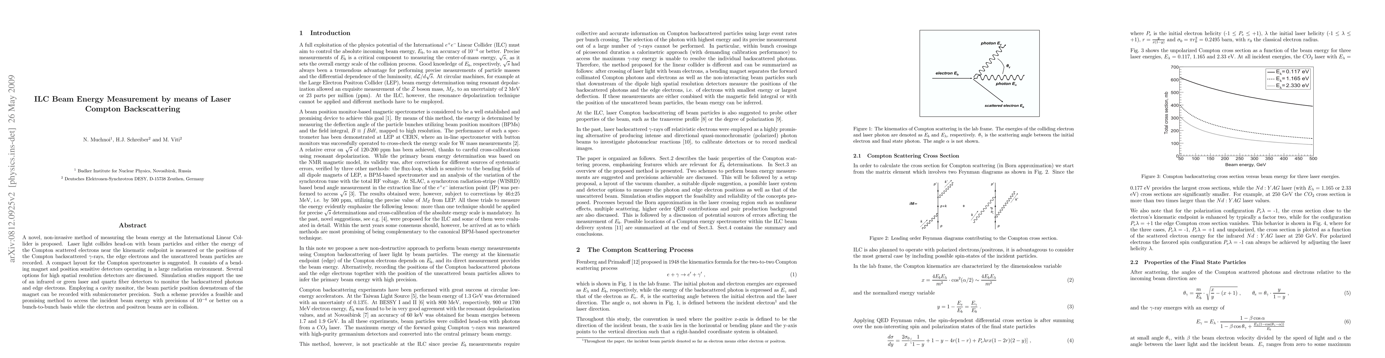 This paper proposes a non-invasive method for measuring beam energy at the International Linear Collider using Laser Compton Backscattering, involving precise detection of Compton scattered electrons or backscattered photons. The suggested compact setup includes a bending magnet and high-resolution detectors, with simulation studies favoring infrared or green lasers and quartz fiber detectors.