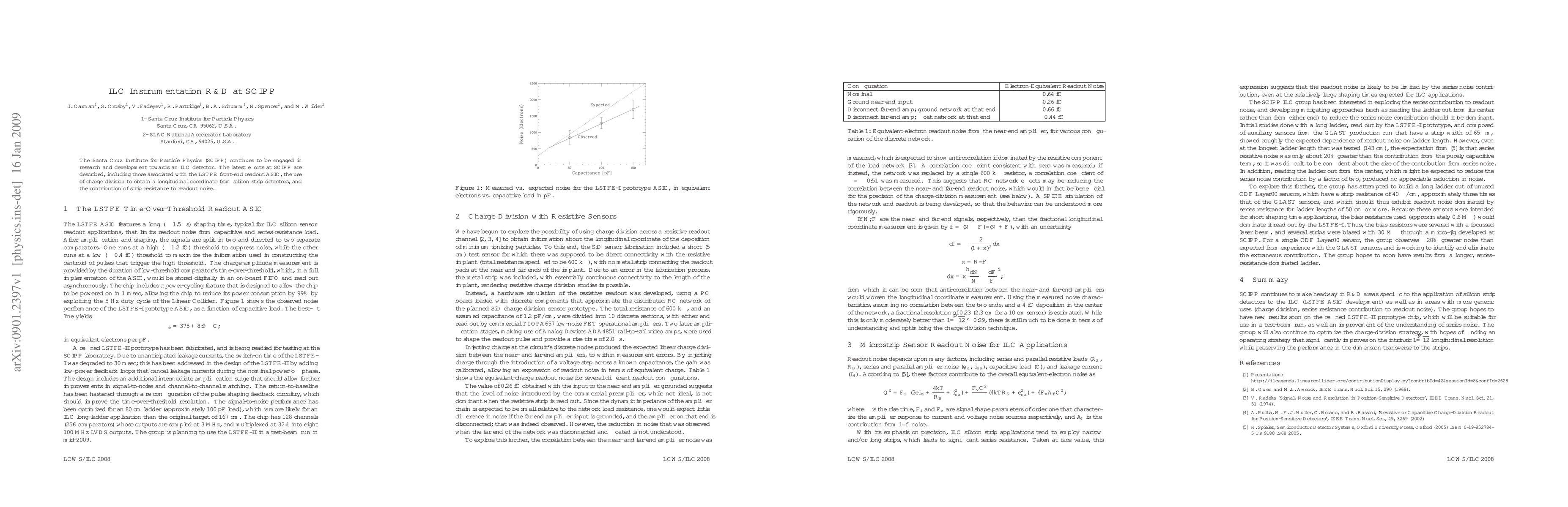 Summary: SCIPP is advancing ILC detector R&D, focusing on the LSTFE front-end readout ASIC, employing charge division for silicon strip detector longitudinal coordinates, and analyzing strip resistance's impact on readout noise.