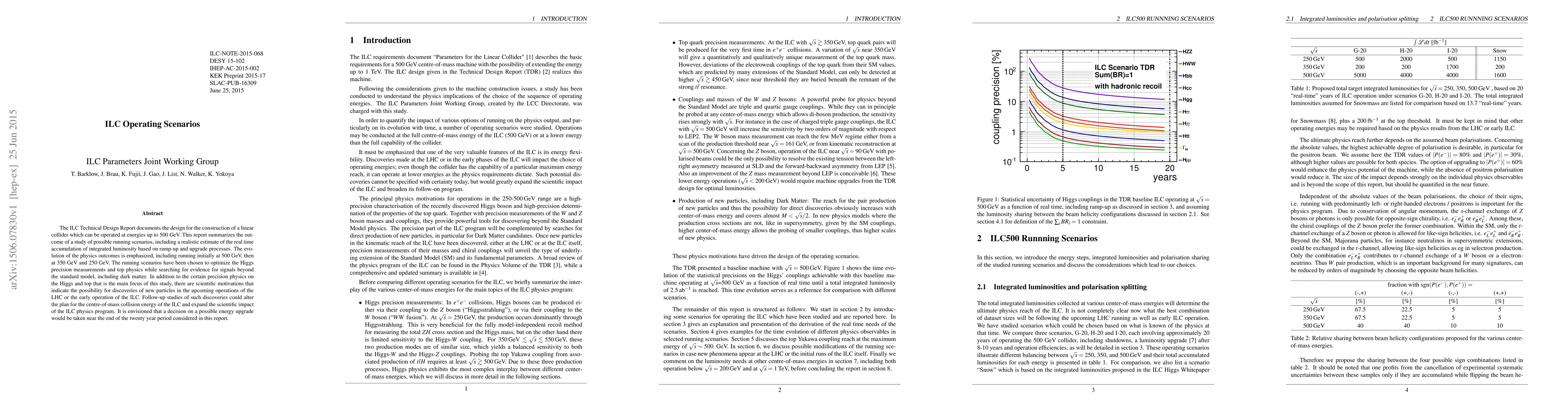 The ILC Technical Design Report outlines a linear collider design for energies up to 500 GeV, detailing optimized running scenarios for Higgs precision, top physics, and searches for beyond-SM signals, including dark matter. The plan envisions potential energy upgrades based on LHC and ILC discovery findings, with a decision anticipated around the twenty-year mark.