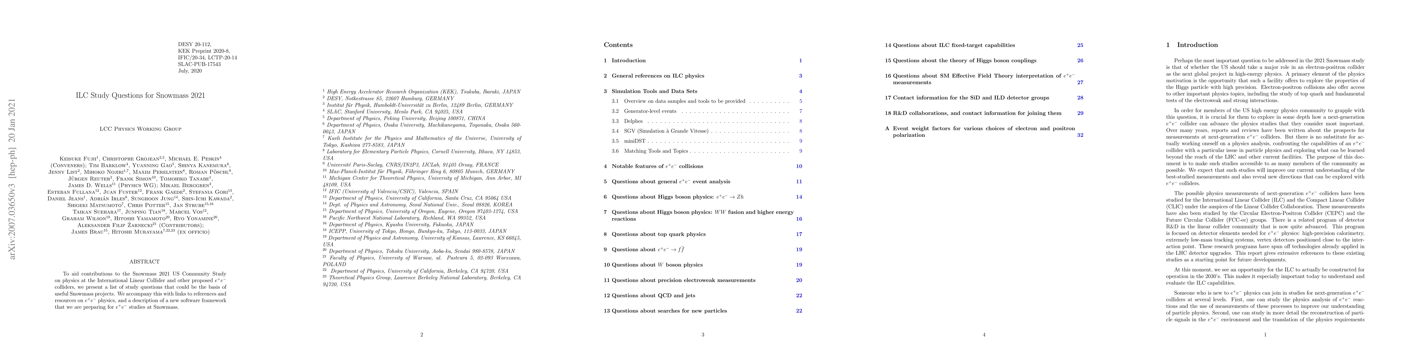 This paper provides a list of study questions to guide projects for the Snowmass 2021 US Community Study on physics at the International Linear Collider and other proposed $e^+e^-$ colliders, along with references and resources on $e^+e^-$ physics, and introduces a new software framework for $e^+e^-$ studies.