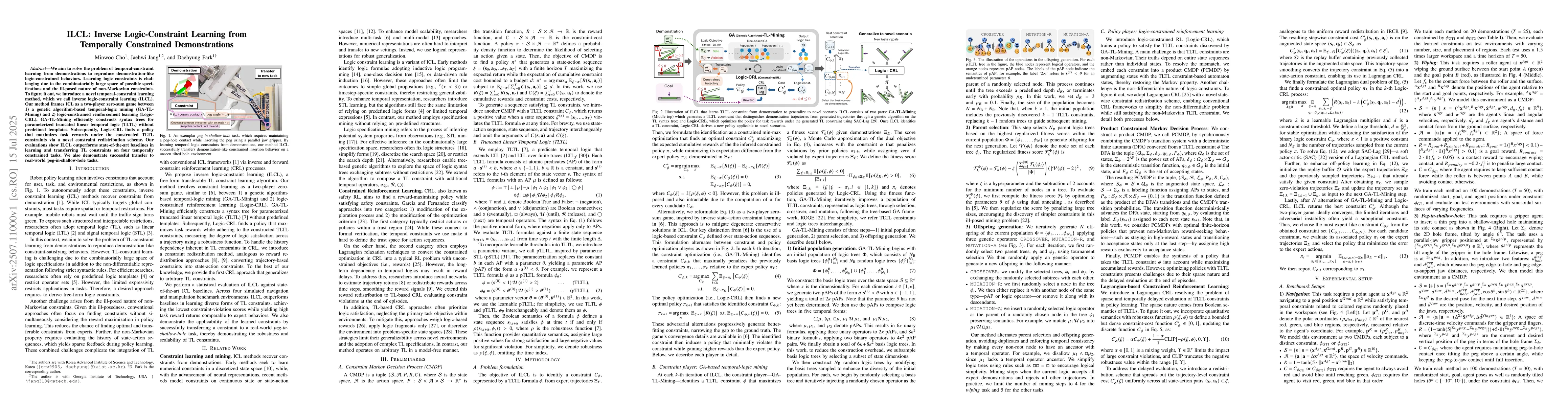 The paper introduces ILCL, a method that tackles temporal-constraint learning from demonstrations using inverse logic-constraint learning. ILCL consists of two components: GA-TL-Mining, which efficiently constructs temporal logic syntax trees, and Logic-CRL, which finds a policy under these constraints. Evaluations show ILCL outperforms existing methods in learning and transferring temporal constraints across various tasks, including real-world applications.
