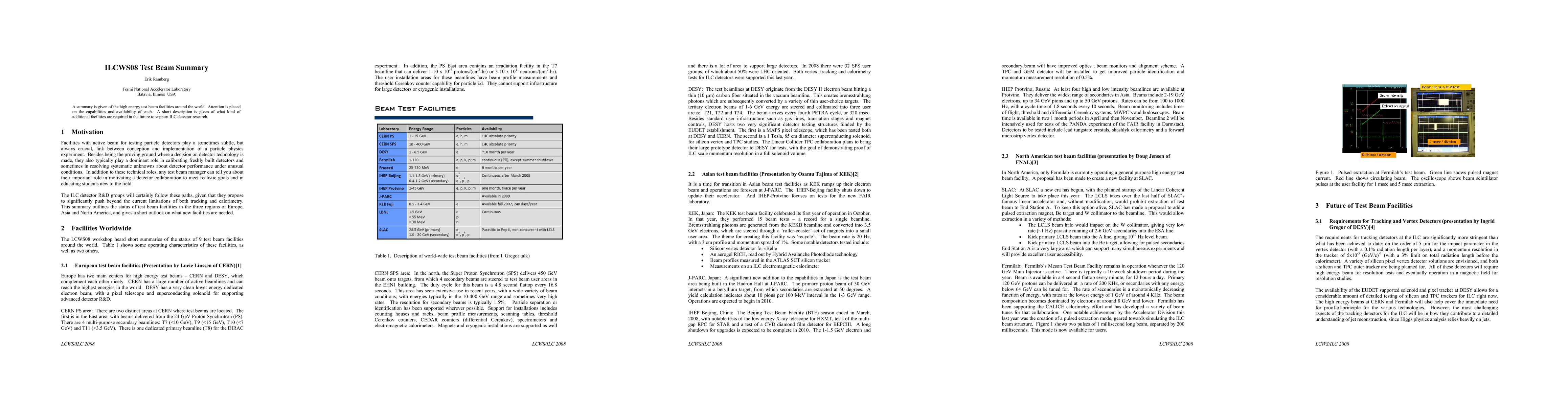 A summary is given of the high energy test beam facilities around the world. Attention is placed on the capabilities and availability of each. A short description is given of what kind of additional facilities are required in the future to support ILC detector research.