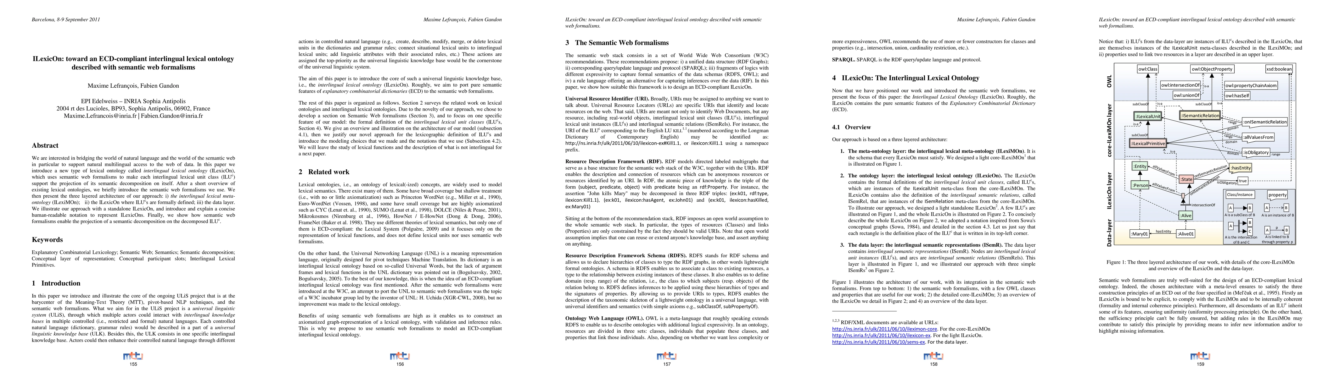 This paper introduces ILexicOn, an interlingual lexical ontology designed to bridge natural language and the semantic web, enabling multilingual access to web data. It presents a three-layered architecture and uses semantic web formalisms to project semantic decompositions on interlingual lexical units.
