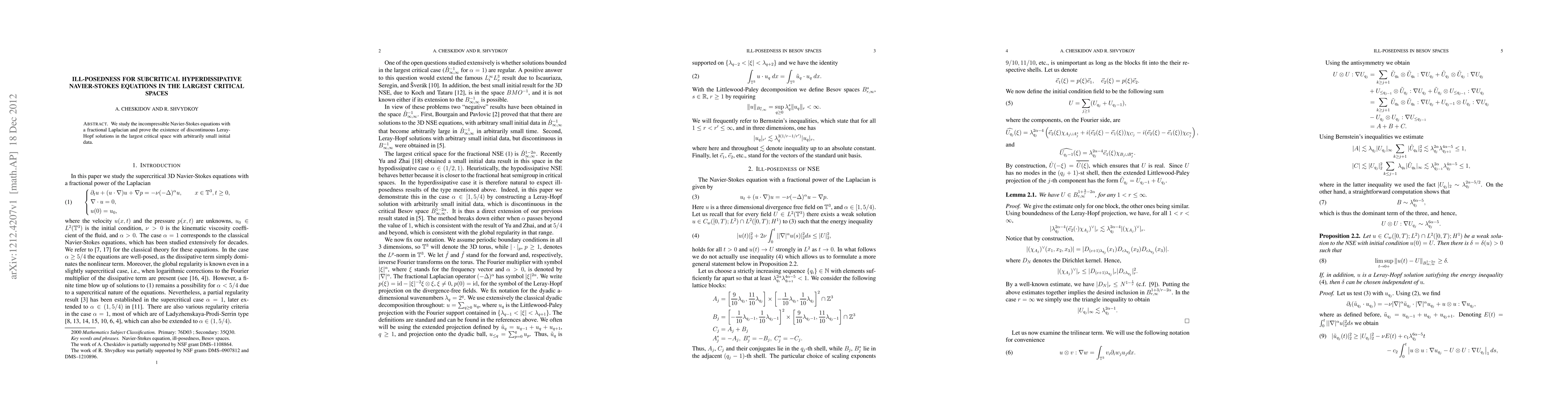 We study the incompressible Navier-Stokes equations with a fractional Laplacian and prove the existence of discontinuous Leray-Hopf solutions in the largest critical space with arbitrarily small initial data.