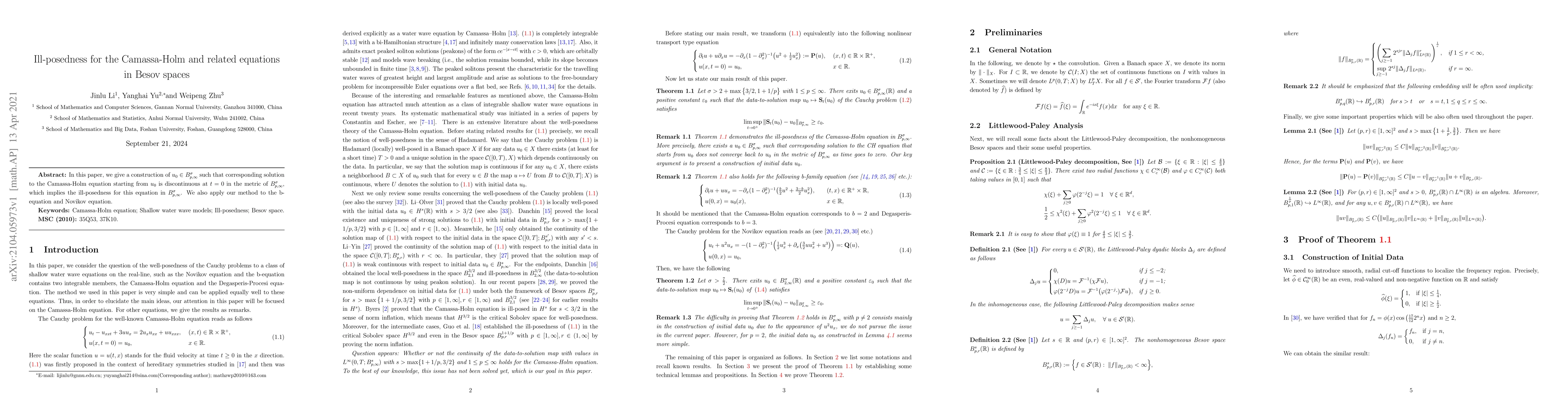 This paper demonstrates the ill-posedness of the Camassa-Holm equation in Besov spaces by constructing a specific initial condition that leads to a discontinuous solution at $t = 0$. The method is also extended to show similar ill-posedness for the b-equation and Novikov equation.