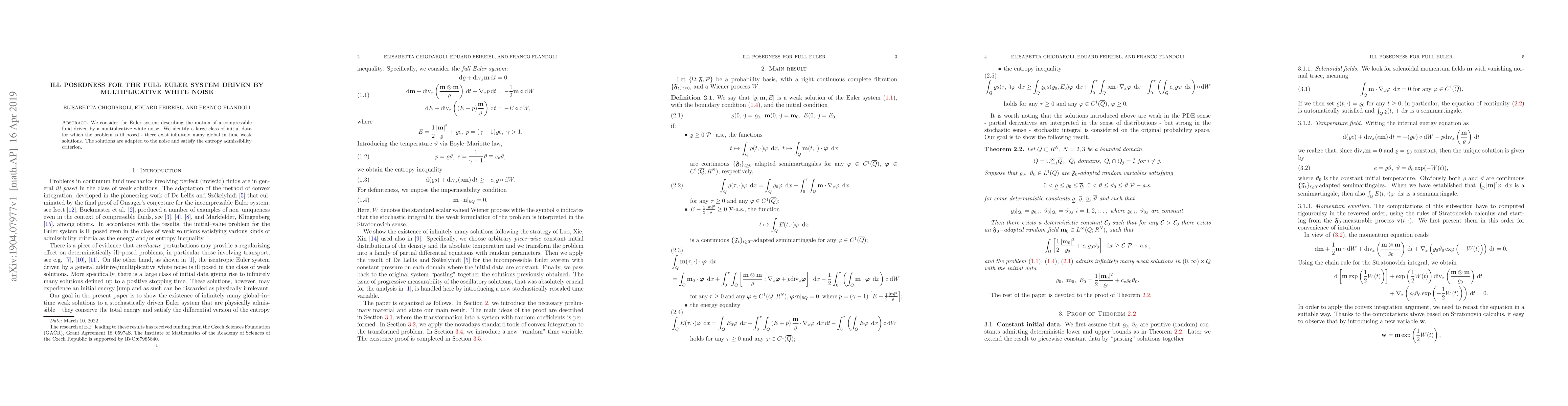 This paper investigates the Euler equations for compressible fluid dynamics influenced by multiplicative white noise, revealing that the problem is ill posed for a broad class of initial conditions, resulting in infinitely many global weak solutions that adapt to the noise and meet the entropy admissibility criterion.