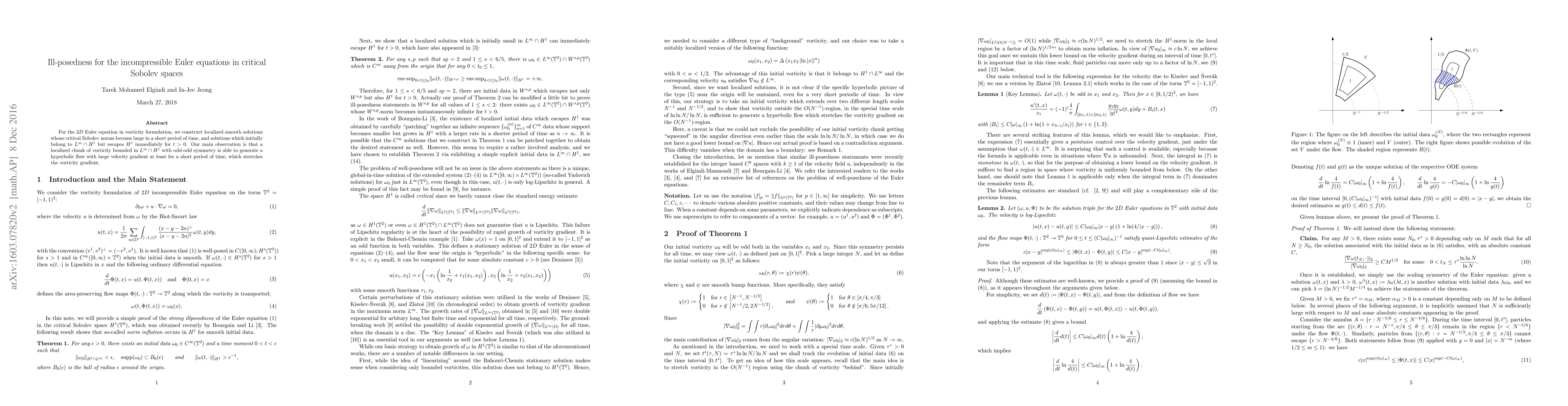 For the $2D$ Euler equation in vorticity formulation, we construct localized smooth solutions whose critical Sobolev norms become large in a short period of time, and solutions which initially belong to $L^\infty \cap H^1$ but escapes $H^1$ immediately for $t>0$. Our main observation is that a localized chunk of vorticity bounded in $L^\infty \cap H^1$ with odd-odd symmetry is able to generate a hyperbolic flow with large velocity gradient at least for a short period of time, which stretches the vorticity gradient.
