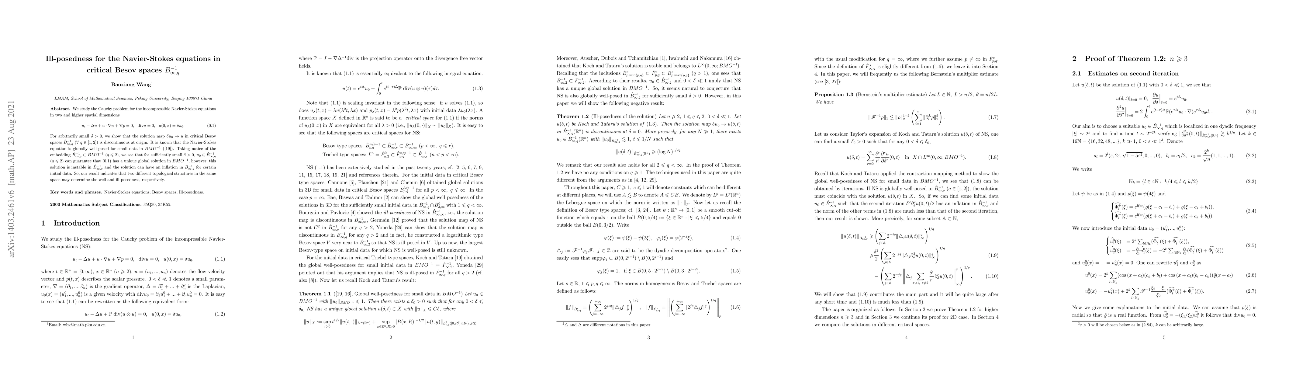 We study the Cauchy problem for the incompressible Navier-Stokes equation \begin{align} u_t -\Delta u+u\cdot \nabla u +\nabla p=0, \ \ {\rm div} u=0, \ \ u(0,x)= \delta u_0. \label{NS} \end{align} For arbitrarily small $\delta>0$, we show that the solution map $\delta u_0 \to u$ in critical Besov spaces $\dot B^{-1}_{\infty,q}$ ($\forall \ q\in [1,2]$) is discontinuous at origin. It is known that the Navier-Stokes equation is globally well-posed for small data in $BMO^{-1}$. Taking notice of the embedding $\dot B^{-1}_{\infty,q} \subset BMO^{-1}$ ($q\le 2$), we see that for sufficiently small $\delta>0$, $u_0\in \dot B^{-1}_{\infty,q} $ ($q\le 2$) can guarantee that the Navier-Stokes equation has a unique global solution in $BMO^{-1}$, however, this solution is instable in $ \dot B^{-1}_{\infty,q} $ and the solution can have an inflation in $\dot B^{-1}_{\infty,q}$ for certain initial data. So, our result indicates that two different topological structures in the same space may determine the well and ill posedness, respectively.
