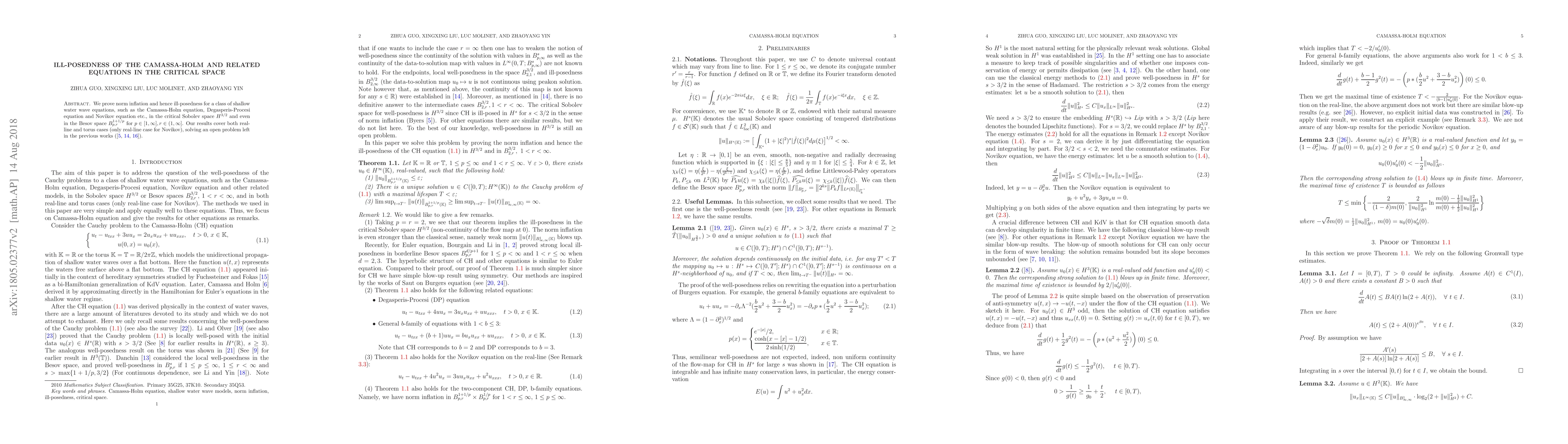 Summary: This paper proves norm inflation and ill-posedness for certain shallow water wave equations, including the Camassa-Holm and Degasperis-Procesi equations, in critical Sobolev and Besov spaces, addressing an open problem from prior studies. The findings apply to both real-line and torus settings.