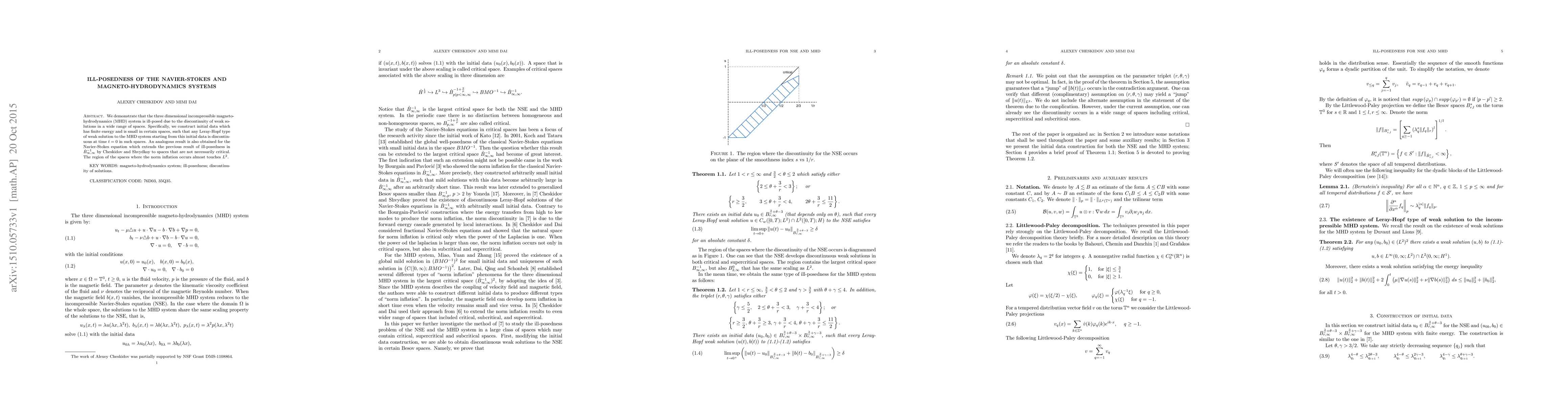 This paper proves that the three-dimensional incompressible MHD system is ill-posed, showing that weak solutions can be discontinuous at $t=0$. An analogous result is established for the Navier-Stokes equation, extending previous findings to broader non-critical spaces.