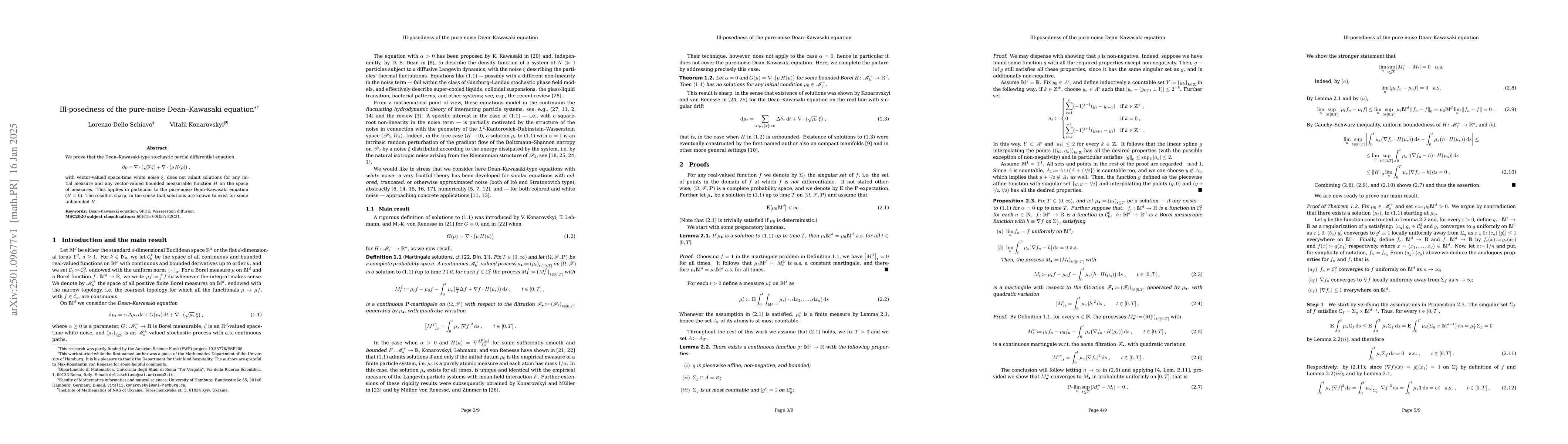 The paper proves that the pure-noise Dean-Kawasaki stochastic partial differential equation lacks solutions under any initial measure and bounded measurable function, showing its ill-posedness. This result holds even for the simplified pure-noise case where the function $H$ is zero, though solutions exist for some unbounded $H$.