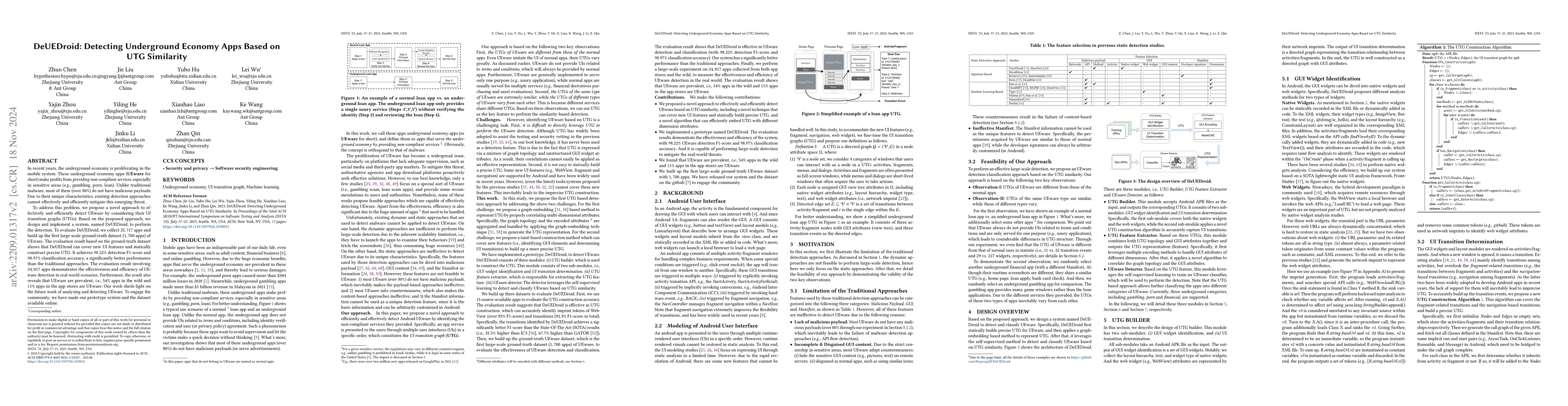 This paper proposes DeUEDroid, a novel system to detect underground economy apps (UEware) that provide illegal services without malicious payloads, by analyzing the transition orders of user interfaces. The evaluation on a large-scale dataset shows that DeUEDroid achieves an accuracy of 77.70% in classifying five categories, significantly outperforming existing methods.