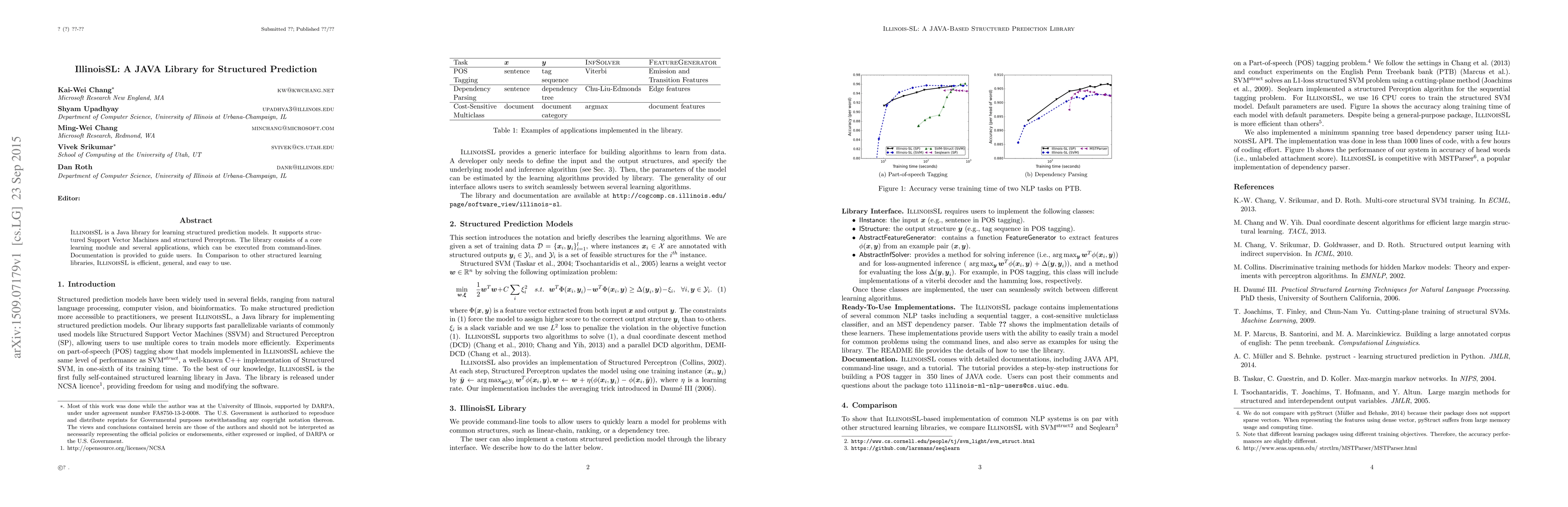 IllinoisSL is a Java library for structured prediction, supporting structured SVMs and Perceptron, featuring efficient and user-friendly applications with comprehensive documentation. Compared to other libraries, it stands out for its general applicability and ease of use.