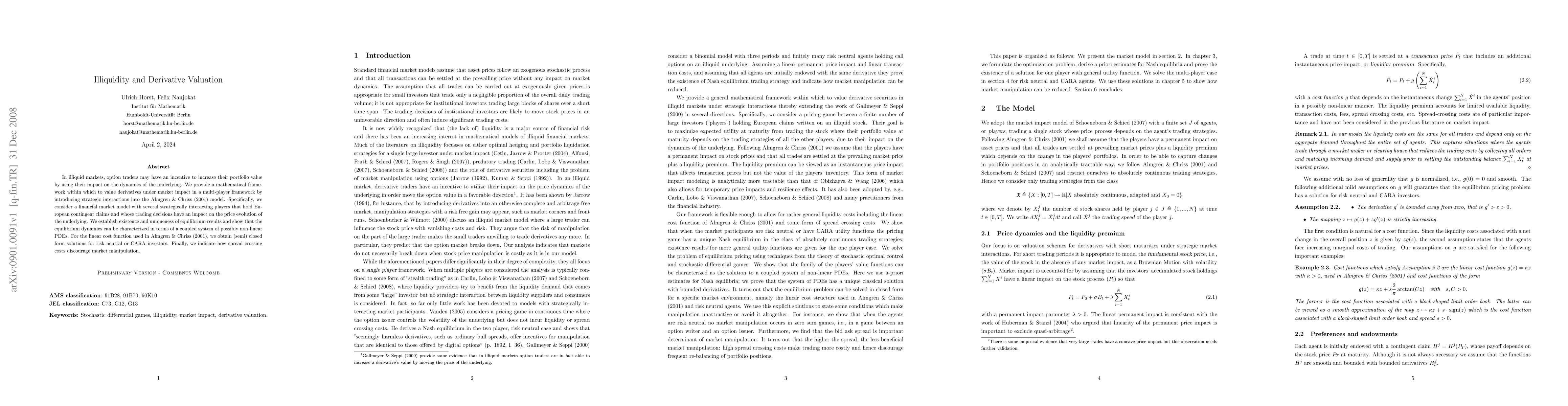 In illiquid markets, option traders may have an incentive to increase their portfolio value by using their impact on the dynamics of the underlying. We provide a mathematical framework within which to value derivatives under market impact in a multi-player framework by introducing strategic interactions into the Almgren & Chriss (2001) model. Specifically, we consider a financial market model with several strategically interacting players that hold European contingent claims and whose trading decisions have an impact on the price evolution of the underlying. We establish existence and uniqueness of equilibrium results and show that the equilibrium dynamics can be characterized in terms of a coupled system of possibly non-linear PDEs. For the linear cost function used in Almgren & Chriss (2001), we obtain (semi) closed form solutions for risk neutral or CARA investors. Finally, we indicate how spread crossing costs discourage market manipulation.