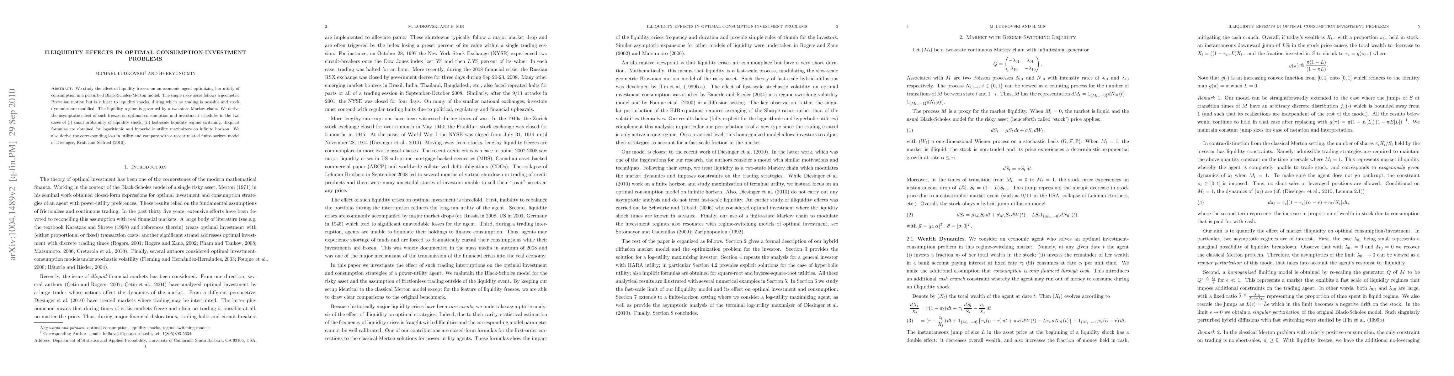 We study the effect of liquidity freezes on an economic agent optimizing her utility of consumption in a perturbed Black-Scholes-Merton model. The single risky asset follows a geometric Brownian motion but is subject to liquidity shocks, during which no trading is possible and stock dynamics are modified. The liquidity regime is governed by a two-state Markov chain. We derive the asymptotic effect of such freezes on optimal consumption and investment schedules in the two cases of (i) small probability of liquidity shock; (ii) fast-scale liquidity regime switching. Explicit formulas are obtained for logarithmic and hyperbolic utility maximizers on infinite horizon. We also derive the corresponding loss in utility and compare with a recent related finite-horizon model of Diesinger, Kraft and Seifried (2009).