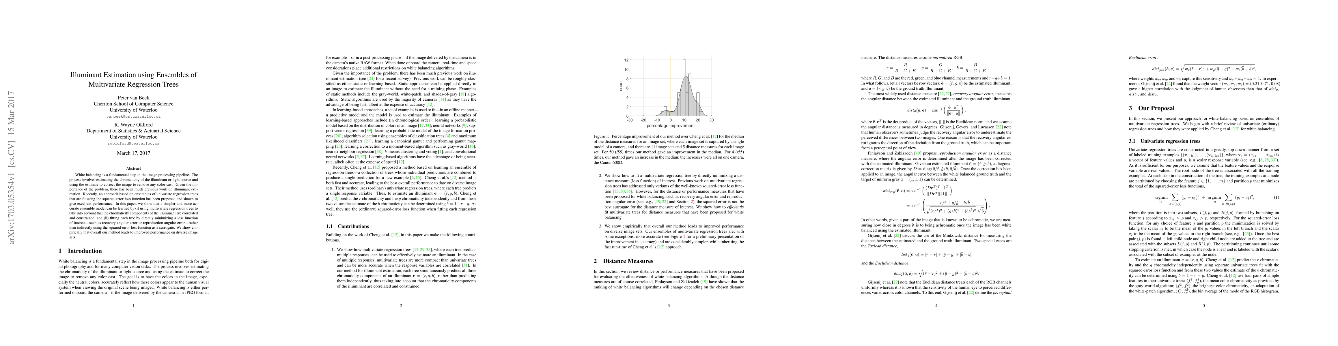 White balancing is a fundamental step in the image processing pipeline. The process involves estimating the chromaticity of the illuminant or light source and using the estimate to correct the image to remove any color cast. Given the importance of the problem, there has been much previous work on illuminant estimation. Recently, an approach based on ensembles of univariate regression trees that are fit using the squared-error loss function has been proposed and shown to give excellent performance. In this paper, we show that a simpler and more accurate ensemble model can be learned by (i) using multivariate regression trees to take into account that the chromaticity components of the illuminant are correlated and constrained, and (ii) fitting each tree by directly minimizing a loss function of interest---such as recovery angular error or reproduction angular error---rather than indirectly using the squared-error loss function as a surrogate. We show empirically that overall our method leads to improved performance on diverse image sets.