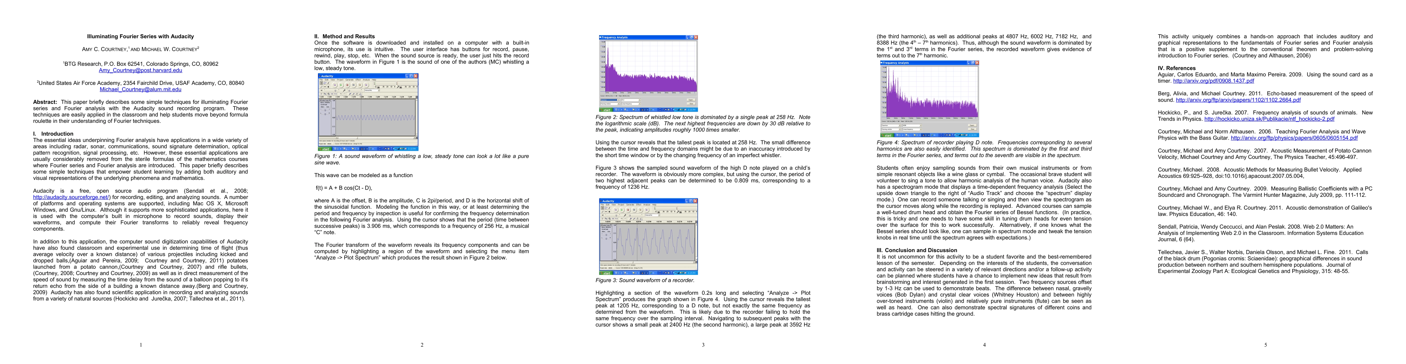 This paper outlines straightforward methods using Audacity to teach Fourier series and analysis, aiming to enhance student comprehension beyond rote memorization. The techniques are practical for classroom use, fostering deeper understanding of Fourier concepts.