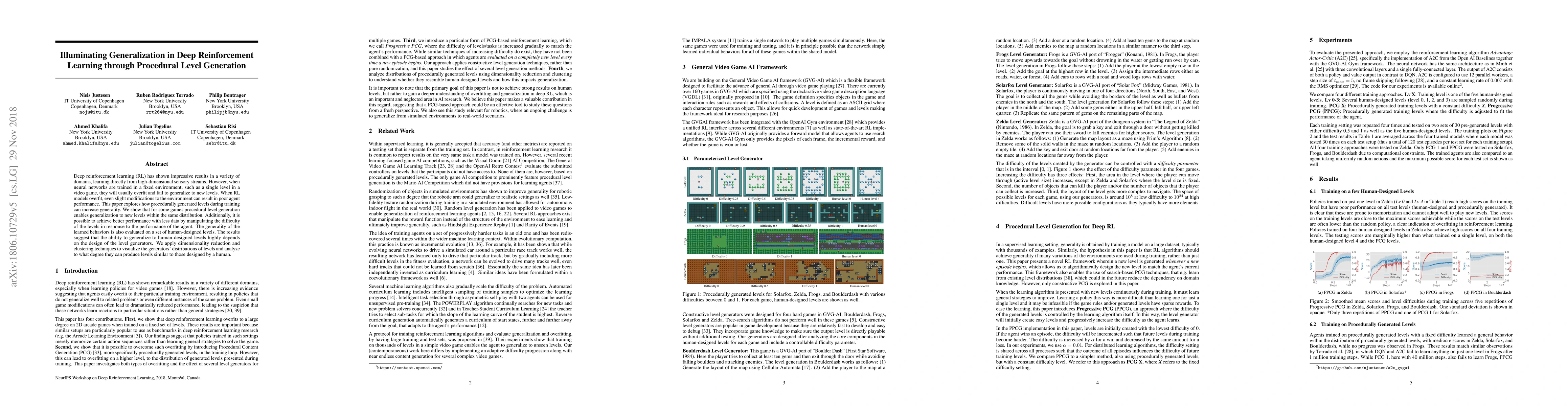 Deep reinforcement learning (RL) has shown impressive results in a variety of domains, learning directly from high-dimensional sensory streams. However, when neural networks are trained in a fixed environment, such as a single level in a video game, they will usually overfit and fail to generalize to new levels. When RL models overfit, even slight modifications to the environment can result in poor agent performance. This paper explores how procedurally generated levels during training can increase generality. We show that for some games procedural level generation enables generalization to new levels within the same distribution. Additionally, it is possible to achieve better performance with less data by manipulating the difficulty of the levels in response to the performance of the agent. The generality of the learned behaviors is also evaluated on a set of human-designed levels. The results suggest that the ability to generalize to human-designed levels highly depends on the design of the level generators. We apply dimensionality reduction and clustering techniques to visualize the generators' distributions of levels and analyze to what degree they can produce levels similar to those designed by a human.