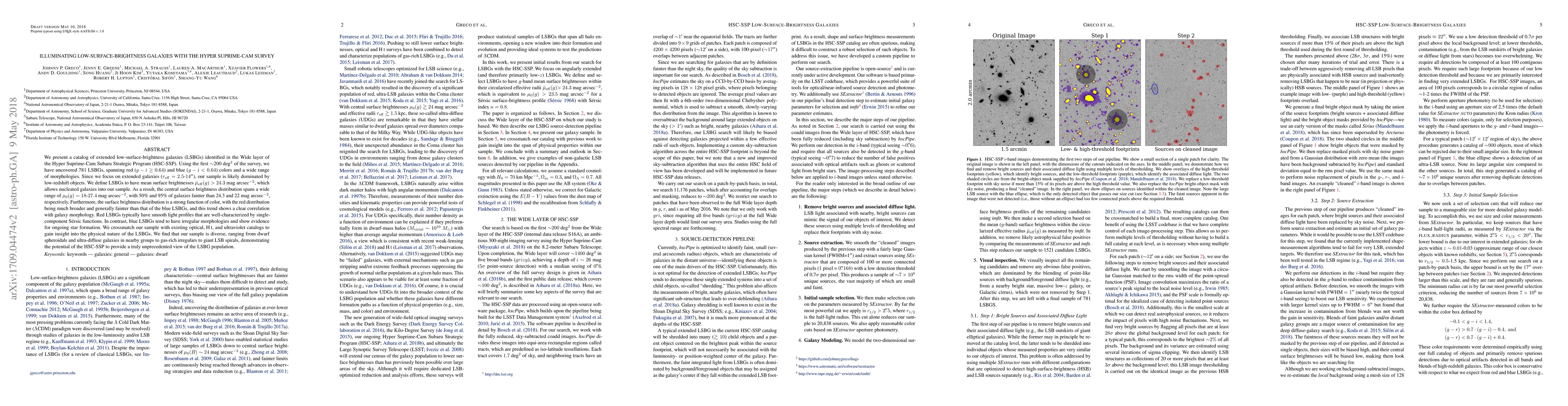 This paper catalogs 781 low-surface-brightness galaxies (LSBGs) identified in the Hyper Suprime-Cam Subaru Strategic Program, revealing a diverse population with varying colors and morphologies. The study highlights a strong correlation between surface brightness and galaxy color, with red LSBGs typically having smoother profiles and blue LSBGs showing signs of ongoing star formation.
