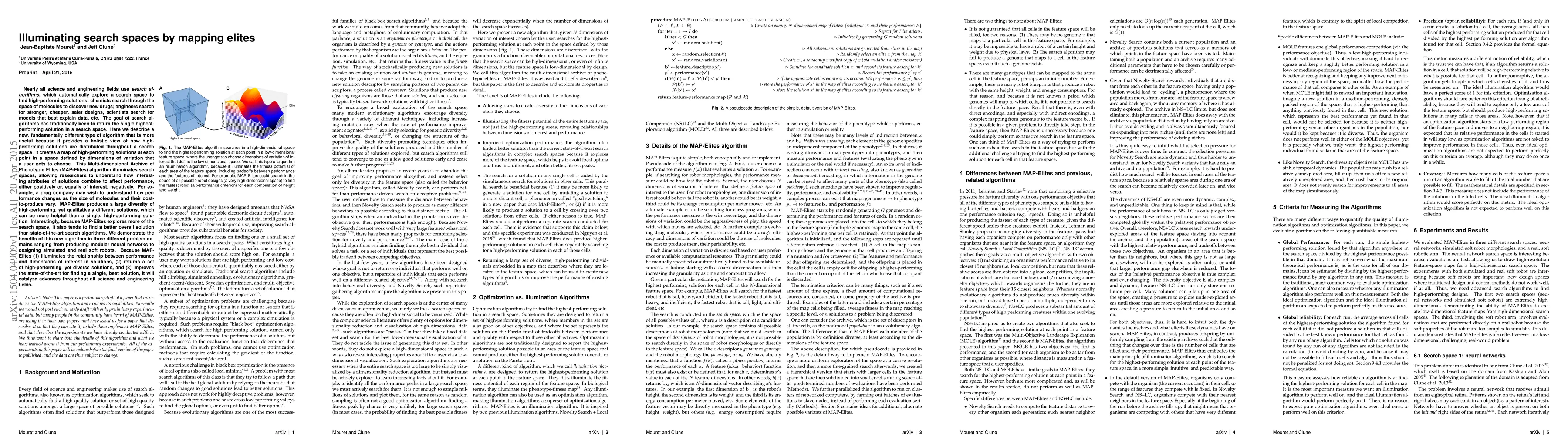 Many fields use search algorithms, which automatically explore a search space to find high-performing solutions: chemists search through the space of molecules to discover new drugs; engineers search for stronger, cheaper, safer designs, scientists search for models that best explain data, etc. The goal of search algorithms has traditionally been to return the single highest-performing solution in a search space. Here we describe a new, fundamentally different type of algorithm that is more useful because it provides a holistic view of how high-performing solutions are distributed throughout a search space. It creates a map of high-performing solutions at each point in a space defined by dimensions of variation that a user gets to choose. This Multi-dimensional Archive of Phenotypic Elites (MAP-Elites) algorithm illuminates search spaces, allowing researchers to understand how interesting attributes of solutions combine to affect performance, either positively or, equally of interest, negatively. For example, a drug company may wish to understand how performance changes as the size of molecules and their cost-to-produce vary. MAP-Elites produces a large diversity of high-performing, yet qualitatively different solutions, which can be more helpful than a single, high-performing solution. Interestingly, because MAP-Elites explores more of the search space, it also tends to find a better overall solution than state-of-the-art search algorithms. We demonstrate the benefits of this new algorithm in three different problem domains ranging from producing modular neural networks to designing simulated and real soft robots. Because MAP- Elites (1) illuminates the relationship between performance and dimensions of interest in solutions, (2) returns a set of high-performing, yet diverse solutions, and (3) improves finding a single, best solution, it will advance science and engineering.