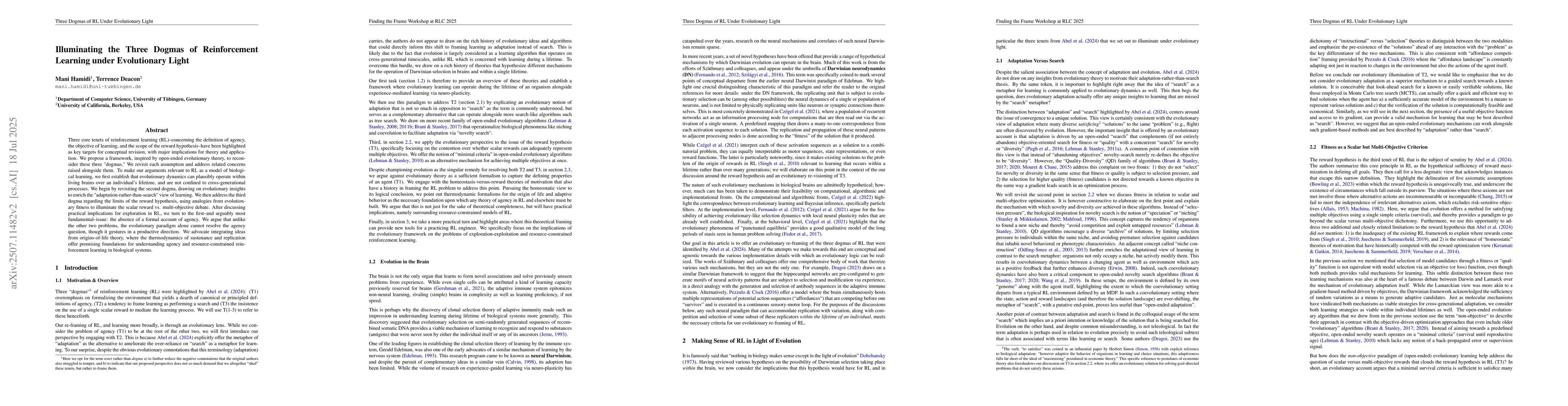 Three core tenets of reinforcement learning (RL)--concerning the definition of agency, the objective of learning, and the scope of the reward hypothesis--have been highlighted as key targets for conceptual revision, with major implications for theory and application. We propose a framework, inspired by open-ended evolutionary theory, to reconsider these three "dogmas." We revisit each assumption and address related concerns raised alongside them. To make our arguments relevant to RL as a model of biological learning, we first establish that evolutionary dynamics can plausibly operate within living brains over an individual's lifetime, and are not confined to cross-generational processes. We begin by revisiting the second dogma, drawing on evolutionary insights to enrich the "adaptation-rather-than-search" view of learning. We then address the third dogma regarding the limits of the reward hypothesis, using analogies from evolutionary fitness to illuminate the scalar reward vs. multi-objective debate. After discussing practical implications for exploration in RL, we turn to the first--and arguably most fundamental--issue: the absence of a formal account of agency. We argue that unlike the other two problems, the evolutionary paradigm alone cannot resolve the agency question, though it gestures in a productive direction. We advocate integrating ideas from origins-of-life theory, where the thermodynamics of sustenance and replication offer promising foundations for understanding agency and resource-constrained reinforcement learning in biological systems.