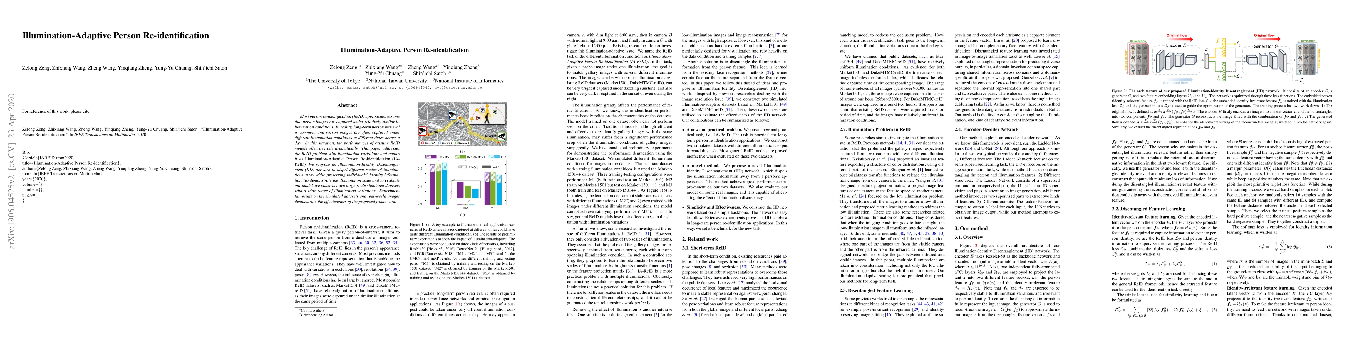This paper introduces Illumination-Adaptive Person Re-identification (IA-ReID) to tackle the challenge of varying illumination conditions in long-term person re-identification. It proposes an Illumination-Identity Disentanglement (IID) network to separate illumination effects while preserving identity information, validated through experiments on newly constructed simulated datasets and real-world images.