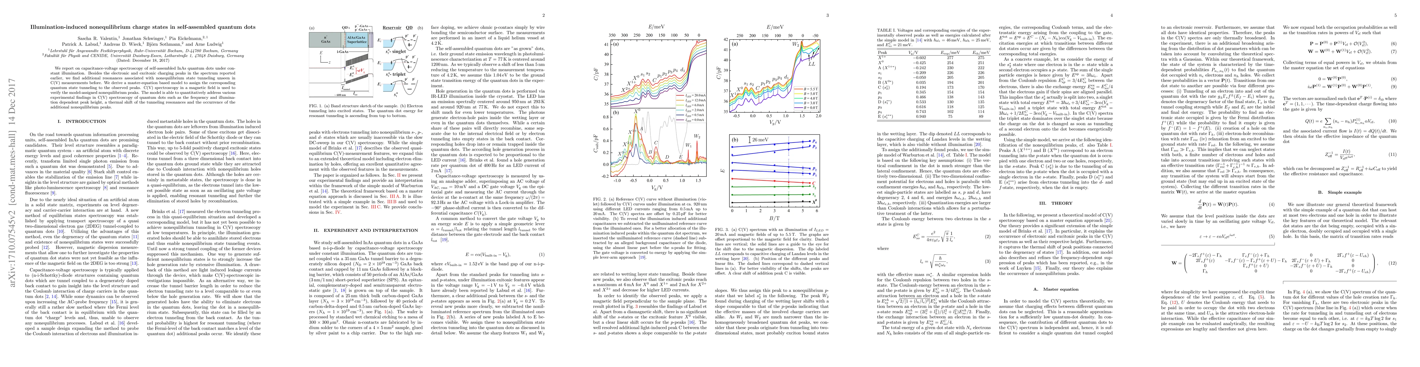 This study investigates capacitance-voltage spectroscopy of illuminated self-assembled InAs quantum dots, revealing additional nonequilibrium charge state tunneling resonances. A master-equation based model successfully explains these phenomena and verifies them using C(V) spectroscopy in magnetic fields.