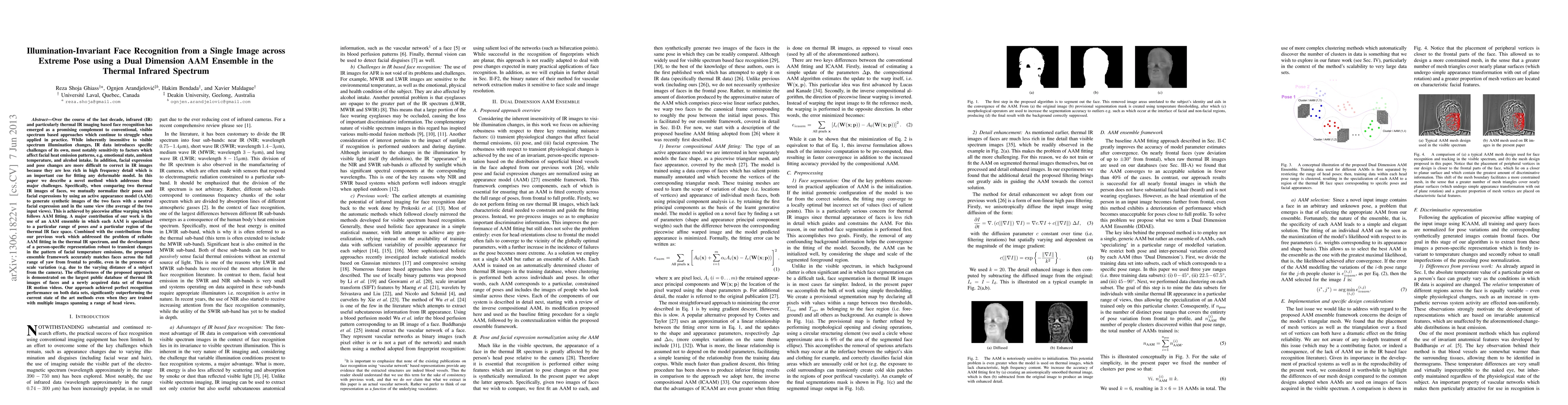 Over the course of the last decade, infrared (IR) and particularly thermal IR imaging based face recognition has emerged as a promising complement to conventional, visible spectrum based approaches which continue to struggle when applied in practice. While inherently insensitive to visible spectrum illumination changes, IR data introduces specific challenges of its own, most notably sensitivity to factors which affect facial heat emission patterns, e.g. emotional state, ambient temperature, and alcohol intake. In addition, facial expression and pose changes are more difficult to correct in IR images because they are less rich in high frequency detail which is an important cue for fitting any deformable model. In this paper we describe a novel method which addresses these major challenges. Specifically, when comparing two thermal IR images of faces, we mutually normalize their poses and facial expressions by using an active appearance model (AAM) to generate synthetic images of the two faces with a neutral facial expression and in the same view (the average of the two input views). This is achieved by piecewise affine warping which follows AAM fitting. A major contribution of our work is the use of an AAM ensemble in which each AAM is specialized to a particular range of poses and a particular region of the thermal IR face space. Combined with the contributions from our previous work which addressed the problem of reliable AAM fitting in the thermal IR spectrum, and the development of a person-specific representation robust to transient changes in the pattern of facial temperature emissions, the proposed ensemble framework accurately matches faces across the full range of yaw from frontal to profile, even in the presence of scale variation (e.g. due to the varying distance of a subject from the camera).