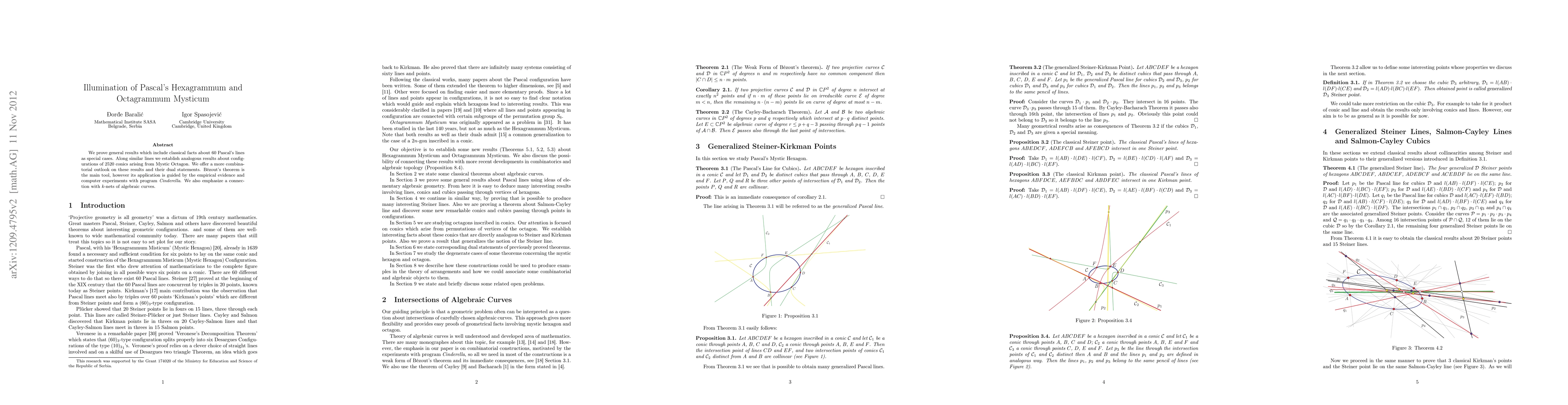 We prove general results which include classical facts about 60 Pascal's lines as special cases. Along similar lines we establish analogous results about configurations of 2520 conics arising from Mystic Octagon. We offer a more combinatorial outlook on these results and their dual statements. Bezout's theorem is the main tool, however its application is guided by the empirical evidence and computer experiments with program Cinderella. We also emphasize a connection with $k$-nets of algebraic curves.