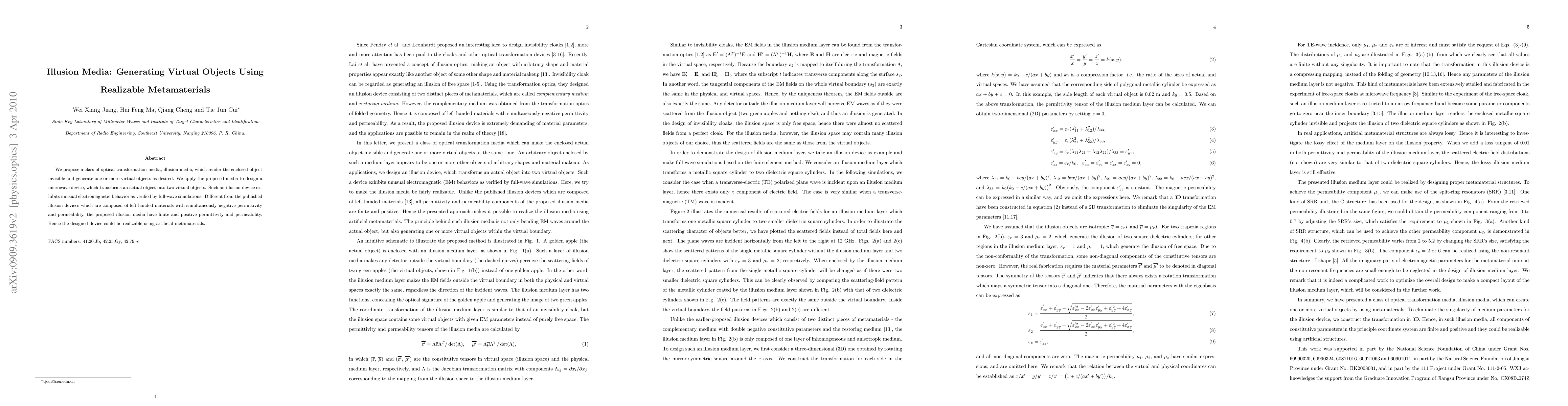 This paper introduces illusion media, a type of optical transformation material that renders enclosed objects invisible and creates virtual objects. The proposed microwave device, made from realizable metamaterials, demonstrates unique electromagnetic behavior and differs from previous devices by using materials with positive permittivity and permeability.