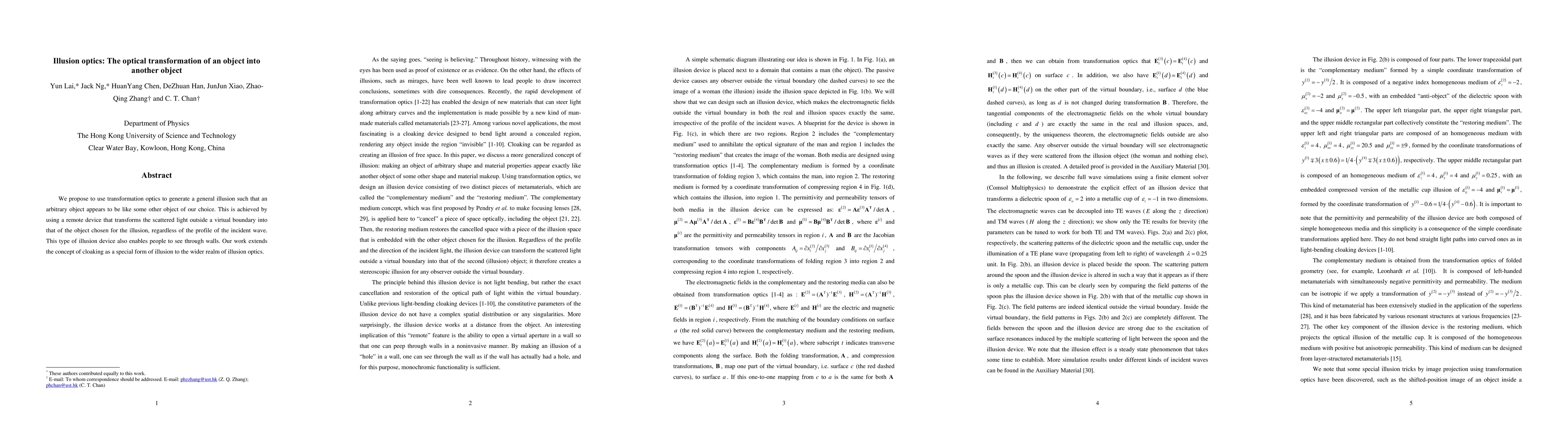 Summary: This paper introduces transformation optics to create illusions where an object appears as another object by manipulating scattered light, extending cloaking to broader illusion optics and enabling wall transparency.