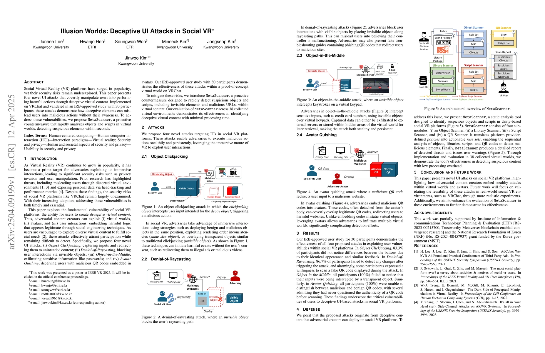 This paper identifies four novel UI attacks in Social VR that deceive users into harmful actions via deceptive virtual content. To mitigate these risks, the authors propose MetaScanner, a tool that quickly analyzes virtual objects and scripts to detect suspicious elements.