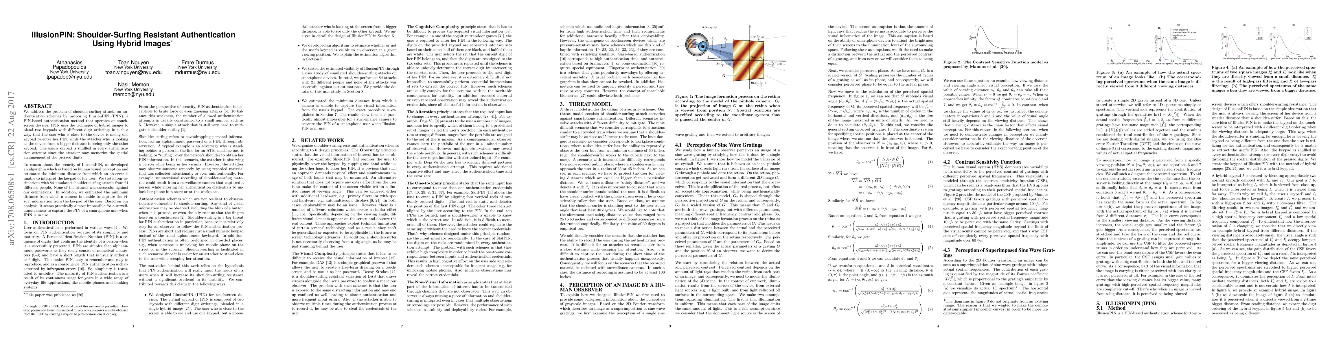 IllusionPIN is a PIN-based authentication method that uses hybrid images to prevent shoulder-surfing attacks by displaying different keypads to users and attackers. The method shuffles the keypad to thwart memorized digit patterns, and tests show no successful attacks within estimated safe distances.