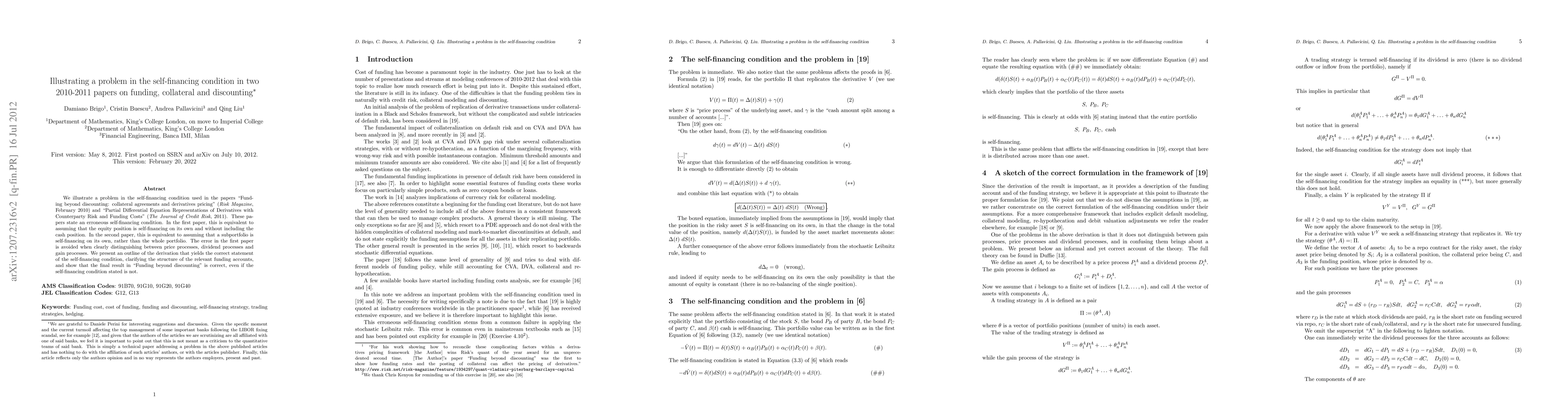 A research paper highlights an error in two 2010-2011 papers on funding, collateral, and discounting, which incorrectly assumed self-financing conditions for equity positions and portfolios. The paper presents the correct derivation of the self-financing condition and shows its accuracy despite the initial mistake.