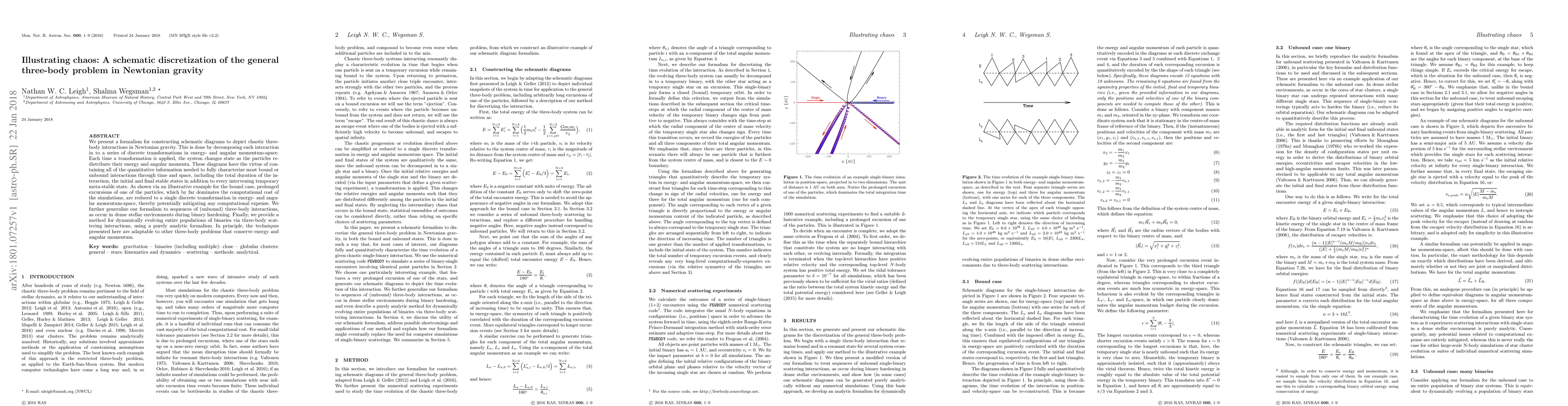 We present a formalism for constructing schematic diagrams to depict chaotic three-body interactions in Newtonian gravity. This is done by decomposing each interaction in to a series of discrete transformations in energy- and angular momentum-space. Each time a transformation is applied, the system changes state as the particles re-distribute their energy and angular momenta. These diagrams have the virtue of containing all of the quantitative information needed to fully characterize most bound or unbound interactions through time and space, including the total duration of the interaction, the initial and final stable states in addition to every intervening temporary meta-stable state. As shown via an illustrative example for the bound case, prolonged excursions of one of the particles, which by far dominates the computational cost of the simulations, are reduced to a single discrete transformation in energy- and angular momentum-space, thereby potentially mitigating any computational expense. We further generalize our formalism to sequences of (unbound) three-body interactions, as occur in dense stellar environments during binary hardening. Finally, we provide a method for dynamically evolving entire populations of binaries via three-body scattering interactions, using a purely analytic formalism. In principle, the techniques presented here are adaptable to other three-body problems that conserve energy and angular momentum.