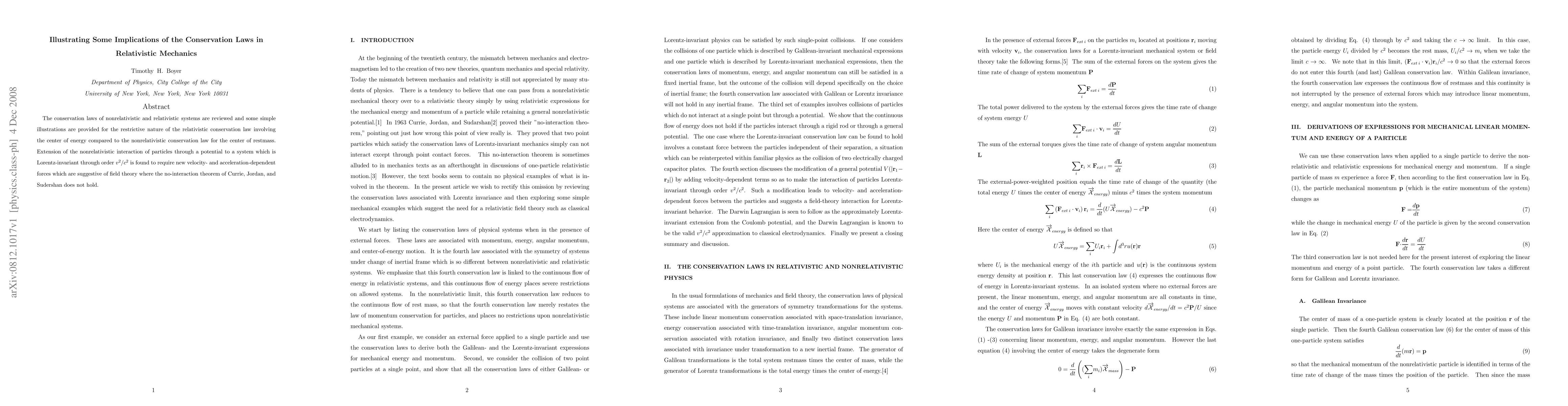 This paper reviews conservation laws in relativistic mechanics, illustrating the stricter nature of relativistic conservation laws compared to nonrelativistic ones. It introduces new velocity- and acceleration-dependent forces for Lorentz-invariant interactions, challenging the no-interaction theorem in field theory.