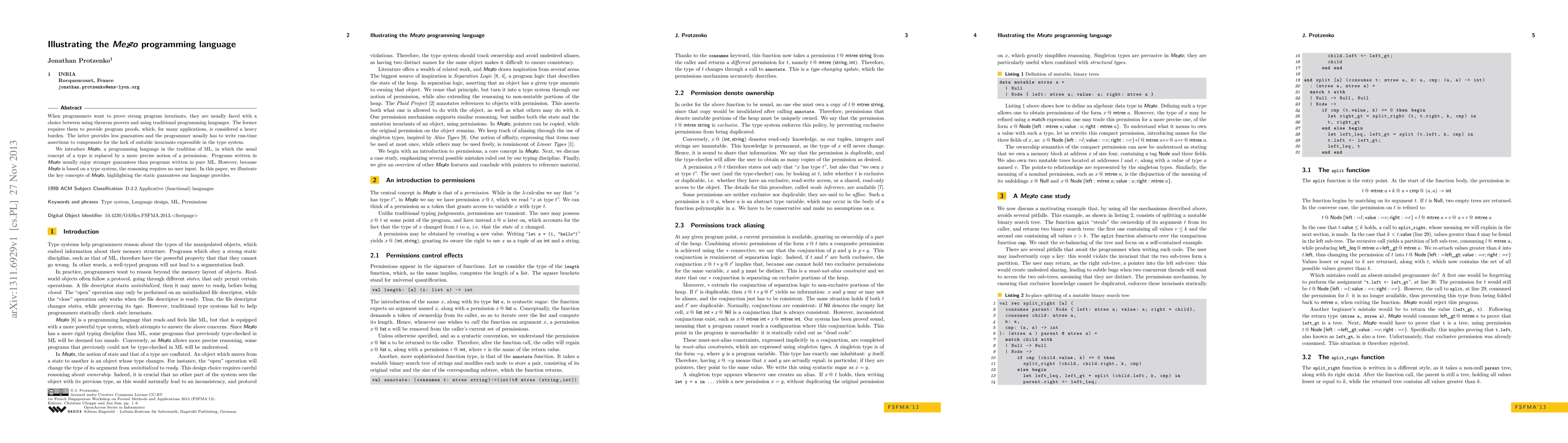 Mezzo is a programming language that provides stronger guarantees than traditional languages like ML, using a permission-based type system to ensure program invariants without user input.