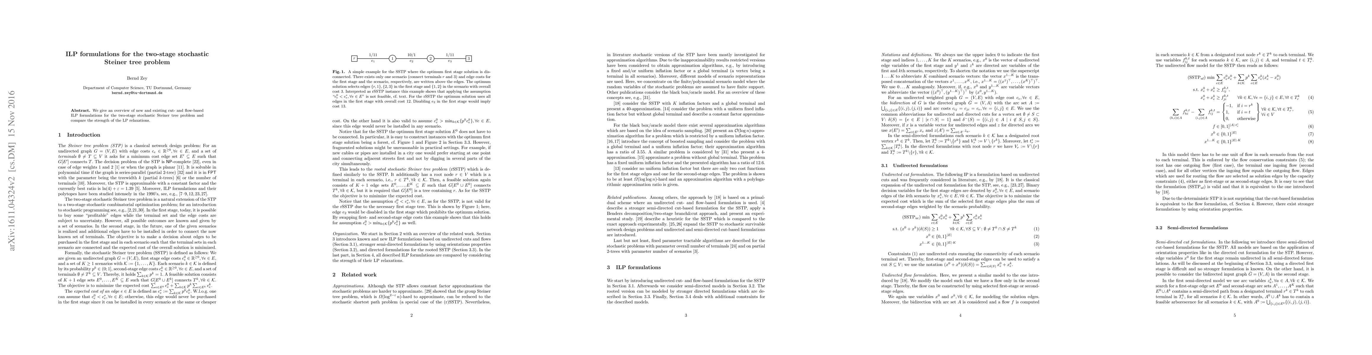 We give an overview of new and existing cut- and flow-based ILP formulations for the two-stage stochastic Steiner tree problem and compare the strength of the LP relaxations.