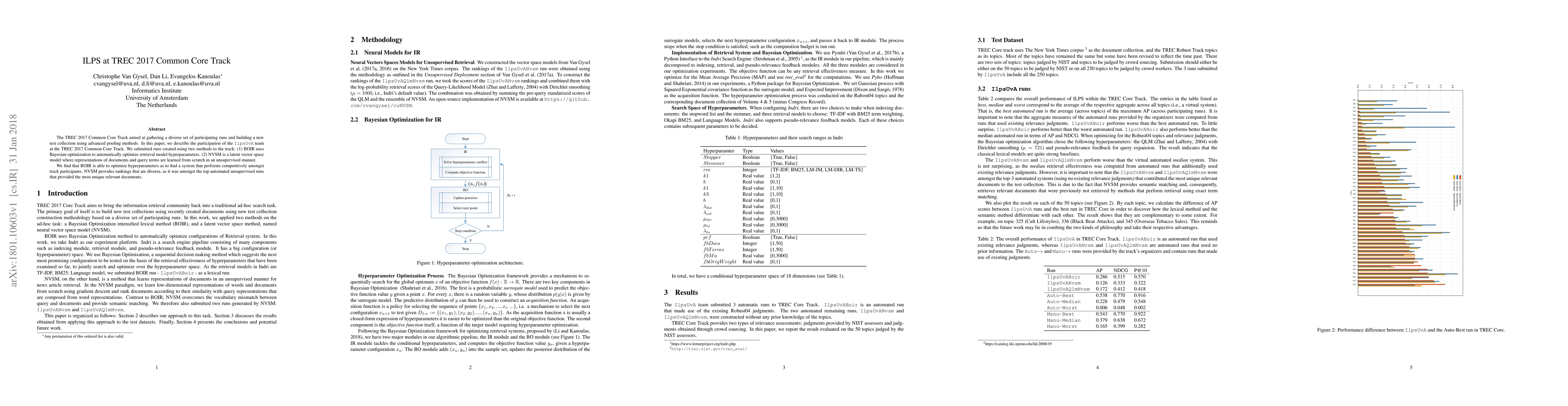 The TREC 2017 Common Core Track aimed at gathering a diverse set of participating runs and building a new test collection using advanced pooling methods. In this paper, we describe the participation of the IlpsUvA team at the TREC 2017 Common Core Track. We submitted runs created using two methods to the track: (1) BOIR uses Bayesian optimization to automatically optimize retrieval model hyperparameters. (2) NVSM is a latent vector space model where representations of documents and query terms are learned from scratch in an unsupervised manner. We find that BOIR is able to optimize hyperparameters as to find a system that performs competitively amongst track participants. NVSM provides rankings that are diverse, as it was amongst the top automated unsupervised runs that provided the most unique relevant documents.