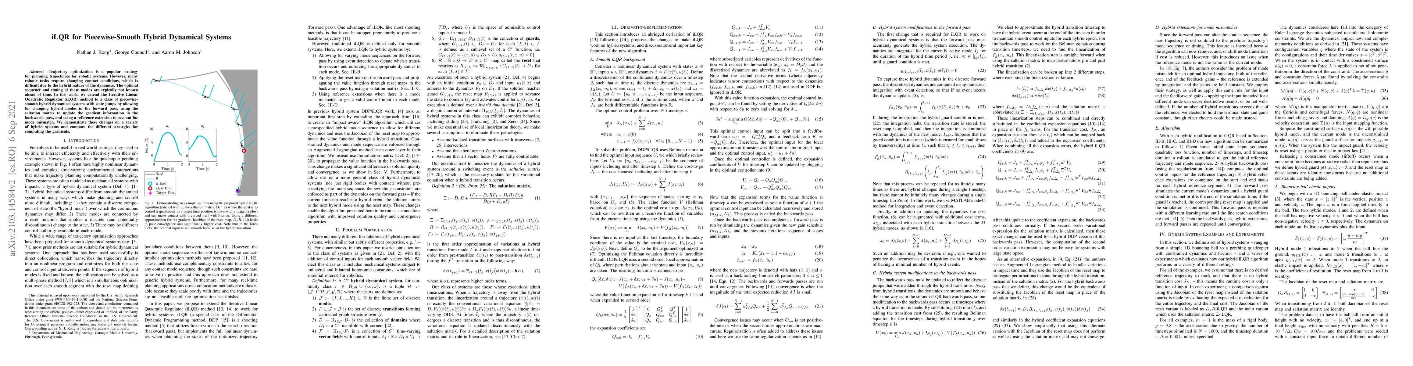 This paper extends the Iterative Linear Quadratic Regulator (iLQR) method to optimize trajectories for piecewise-smooth hybrid dynamical systems, addressing the challenges of changing contact conditions. The approach uses a saltation matrix to update gradient information and a reference extension to handle mode mismatch.