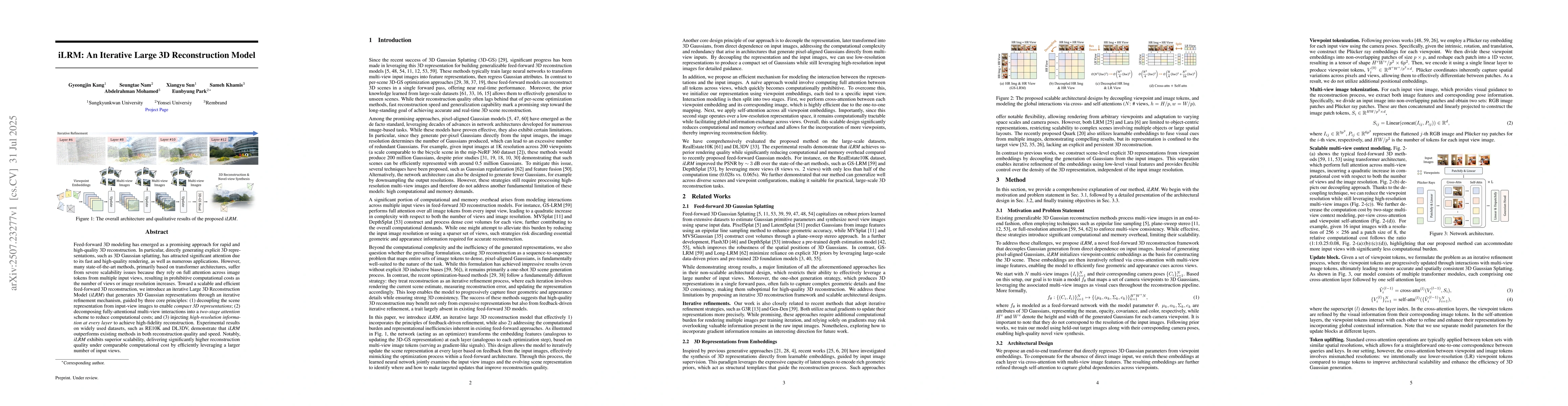 Feed-forward 3D modeling has emerged as a promising approach for rapid and high-quality 3D reconstruction. In particular, directly generating explicit 3D representations, such as 3D Gaussian splatting, has attracted significant attention due to its fast and high-quality rendering, as well as numerous applications. However, many state-of-the-art methods, primarily based on transformer architectures, suffer from severe scalability issues because they rely on full attention across image tokens from multiple input views, resulting in prohibitive computational costs as the number of views or image resolution increases. Toward a scalable and efficient feed-forward 3D reconstruction, we introduce an iterative Large 3D Reconstruction Model (iLRM) that generates 3D Gaussian representations through an iterative refinement mechanism, guided by three core principles: (1) decoupling the scene representation from input-view images to enable compact 3D representations; (2) decomposing fully-attentional multi-view interactions into a two-stage attention scheme to reduce computational costs; and (3) injecting high-resolution information at every layer to achieve high-fidelity reconstruction. Experimental results on widely used datasets, such as RE10K and DL3DV, demonstrate that iLRM outperforms existing methods in both reconstruction quality and speed. Notably, iLRM exhibits superior scalability, delivering significantly higher reconstruction quality under comparable computational cost by efficiently leveraging a larger number of input views.