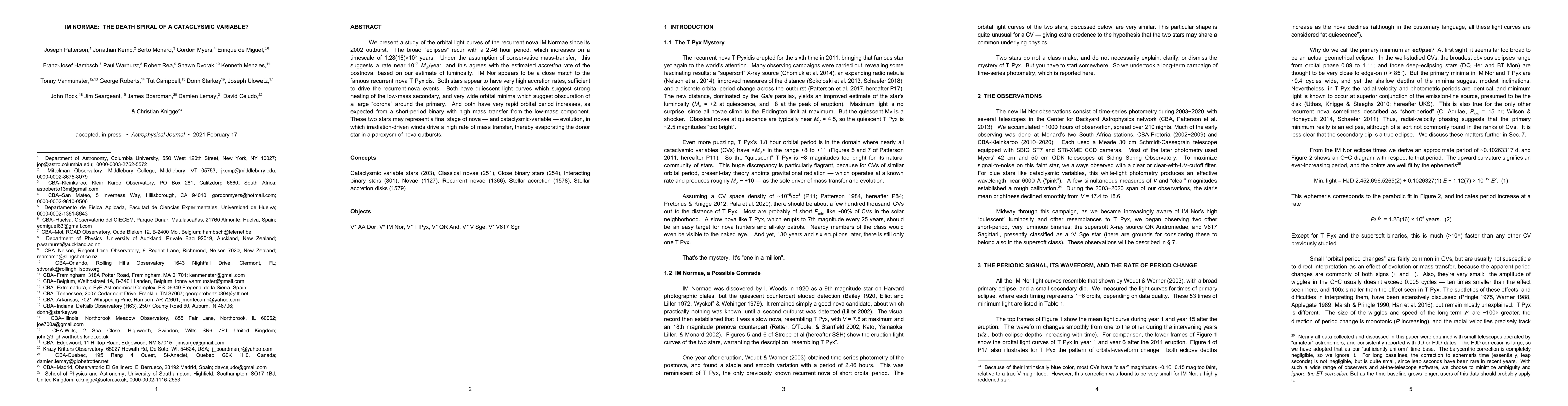 We present a study of the orbital light curves of the recurrent nova IM Normae since its 2002 outburst. The broad "eclipses" recur with a 2.46 hour period, which increases on a timescale of 1.28(16)x10^6 years. Under the assumption of conservative mass-transfer, this suggests a rate near 10^-7 M_sol/year, and this agrees with the estimated /accretion/ rate of the postnova, based on our estimate of luminosity. IM Nor appears to be a close match to the famous recurrent nova T Pyxidis. Both stars appear to have very high accretion rates, sufficient to drive the recurrent-nova events. Both have quiescent light curves which suggest strong heating of the low-mass secondary, and very wide orbital minima which suggest obscuration of a large "corona" around the primary. And both have very rapid orbital period increases, as expected from a short-period binary with high mass transfer from the low-mass component. These two stars may represent a final stage of nova -- and cataclysmic-variable -- evolution, in which irradiation-driven winds drive a high rate of mass transfer, thereby evaporating the donor star in a paroxysm of nova outbursts.