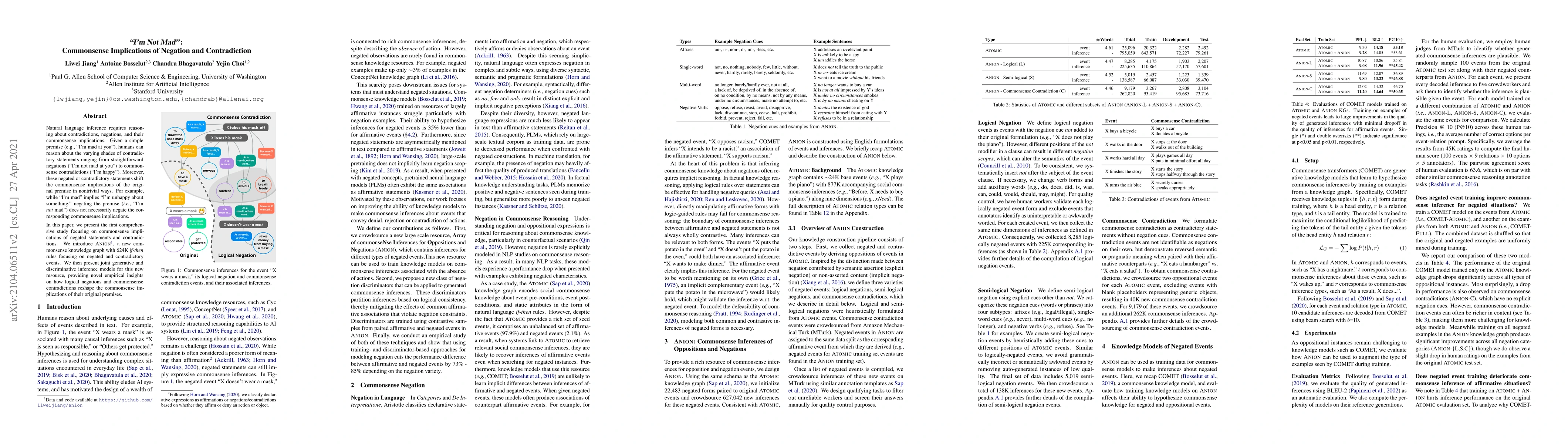 Natural language inference requires reasoning about contradictions, negations, and their commonsense implications. Given a simple premise (e.g., "I'm mad at you"), humans can reason about the varying shades of contradictory statements ranging from straightforward negations ("I'm not mad at you") to commonsense contradictions ("I'm happy"). Moreover, these negated or contradictory statements shift the commonsense implications of the original premise in nontrivial ways. For example, while "I'm mad" implies "I'm unhappy about something," negating the premise (i.e., "I'm not mad") does not necessarily negate the corresponding commonsense implications. In this paper, we present the first comprehensive study focusing on commonsense implications of negated statements and contradictions. We introduce ANION1, a new commonsense knowledge graph with 624K if-then rules focusing on negated and contradictory events. We then present joint generative and discriminative inference models for this new resource, providing novel empirical insights on how logical negations and commonsense contradictions reshape the commonsense implications of their original premises.
